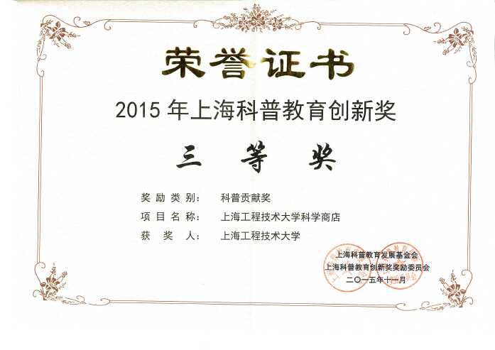 11月8日举行的2015年上海科普教育创新奖颁奖典礼上,上海工程技术大学科学商店从全市100多个申报项目中脱颖而出,作为本年度唯一一家高校科学商店荣获上海市科普教育创新奖科普贡献奖(组织)三等奖的殊荣,这是我校首次获得该项荣誉。