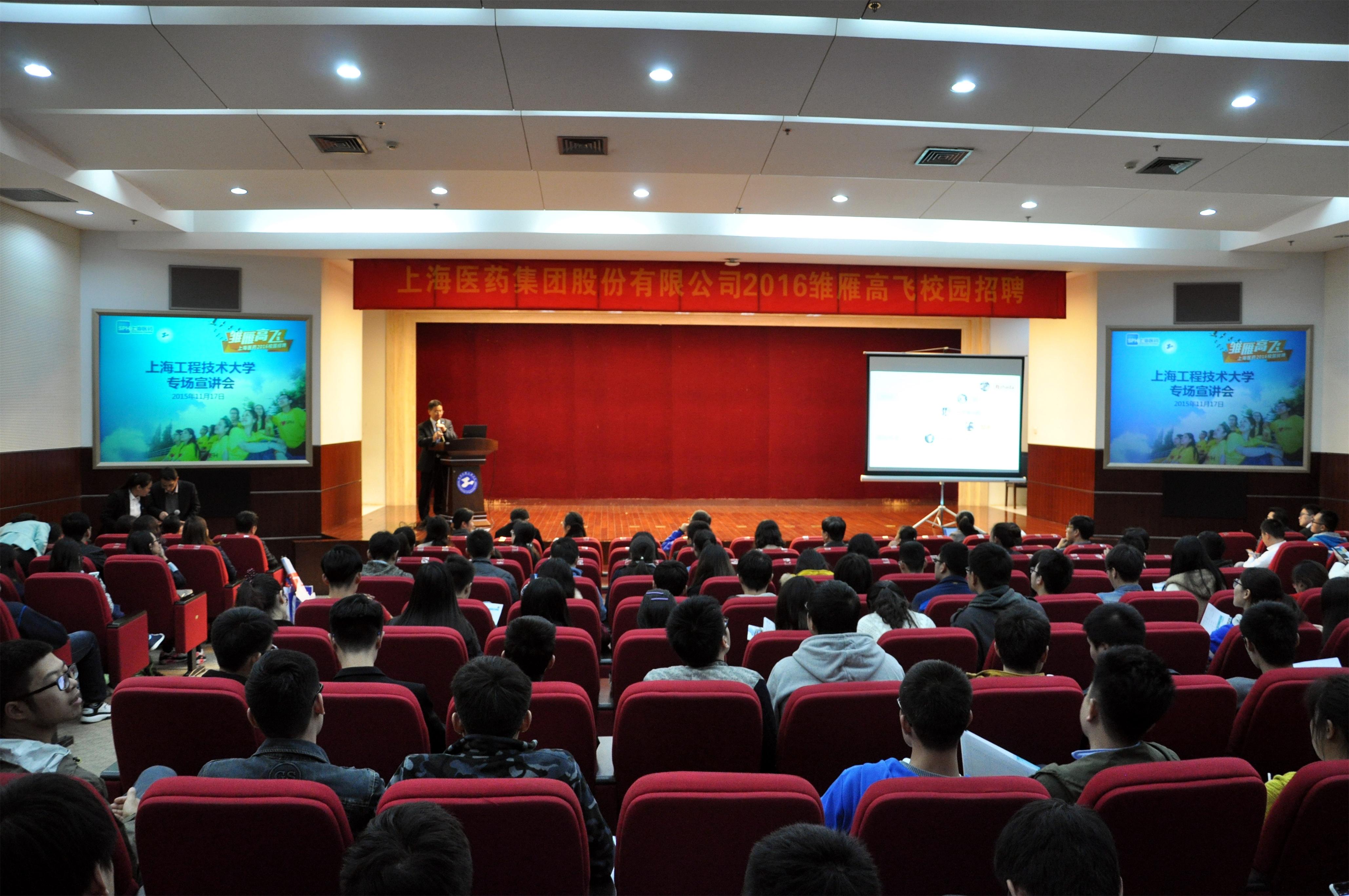 300余名校内外应届毕业生参加了宣讲会。宣讲会伊始,工作人员播放了公司宣传片,帮助同学们了解企业文化。随后,上海医药集团有限公司人力资源部总经理唐坚豪详细介绍了公司的基本情况、核心理念以及发展前景,他诚邀广大毕业生加入上药集团的大家庭。参加本次招聘会的下属子公司招聘代表就本公司的情况依次作了简短介绍,邵奇、陆洁、朱俊等现就职于上药集团各下属子公司的校友代表则从个人的角度,向大家讲述了他们在上药集团的工作体会及享受到的公司福利,让在座学生对企业有了更加深入的认识。