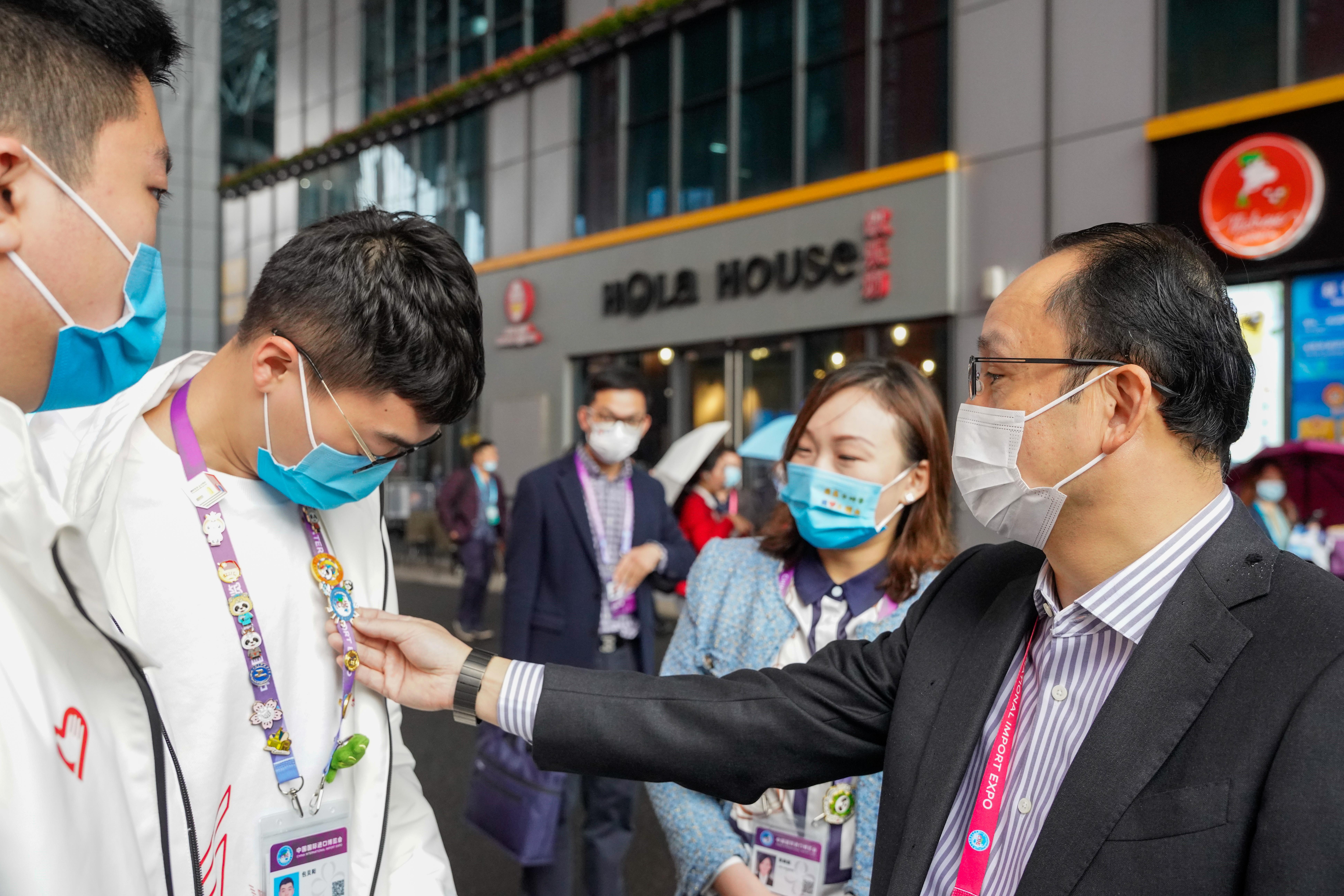 在医疗展区,校领导认真倾听我校志愿者对于各大医疗产业参展商的介绍,并对志愿者们专业的讲解表示高度肯定。校领导强调,上海目前拥有国内一流的防疫机制和防疫成果,在疫情仍呈现多点散发状态下,每位志愿者要在完成岗位服务之余做好自身防疫,积极配合核酸检测和健康监测工作,及时增添衣物和休息调整,让全世界看到中国的防疫成果。