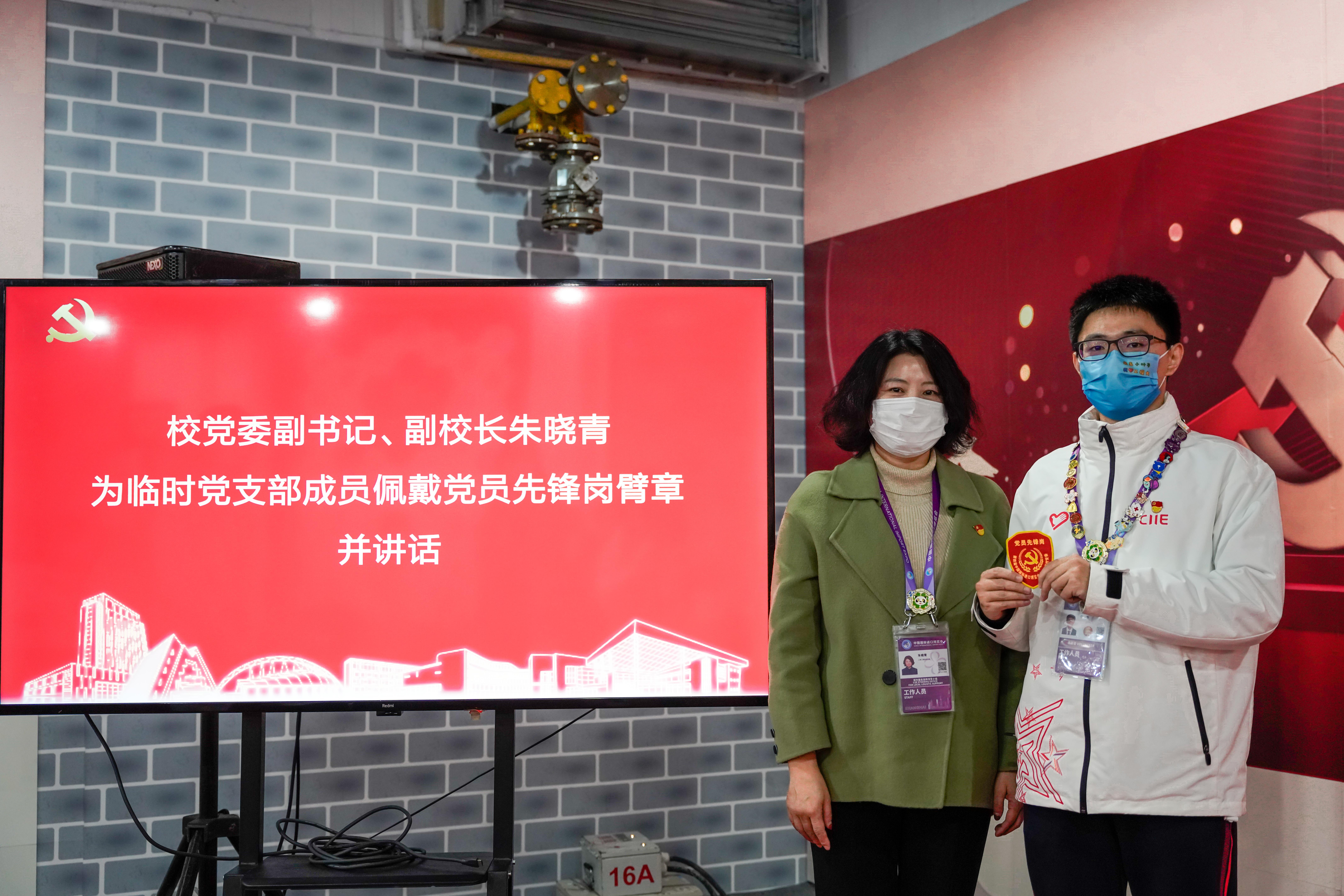 副书记、副校长朱晓青在志愿者之家信仰大厅出席我校第四届进博会临时党支部组织生活,为党员志愿者代表授予党员先锋岗徽章。她勉励志愿者们要提高政治站位,成长为助力中国开放的建设者、服务者、奉献者;勇于担当作为,争做加强党性锻炼、增强党性修养的先锋力量;践行初心使命,争当严于律己、心系群众的表率,成为进博会中靓丽的风景线。