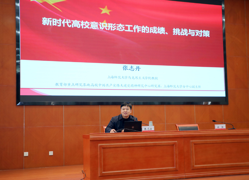 为进一步落实学校意识形态工作责任制,全面准确地学习贯彻习近平总书记关于意识形态工作的重要论述精神,坚决打好防范化解意识形态领域风险的主动仗,11月23日下午,校党委中心组在行政楼B301举行专题(扩大)学习会,特邀上海师范大学马克思主义学院院长,哲学博士张志丹教授作《新时代高校意识形态工作的成绩、挑战与对策》专题辅导报告。校党委中心组成员、中层干部、辅导员参会,会议由校党委常委、党委宣传部部长徐阳主持。