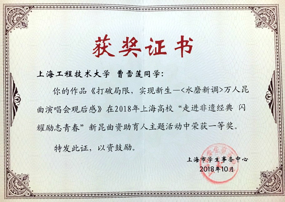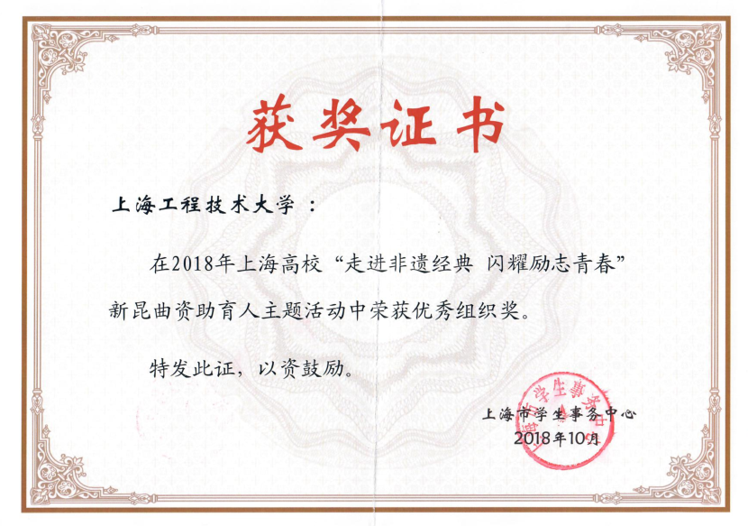 11月25日,上海市学生事务中心公布了2018年上海高校“走进非遗经典 闪耀励志青春”新昆曲资助育人主题活动获奖名单。外国语学院本科生曹雪莲、机械与汽车工程学院本科生武建龙分获一、二等奖,我校荣获“优秀组织奖”。