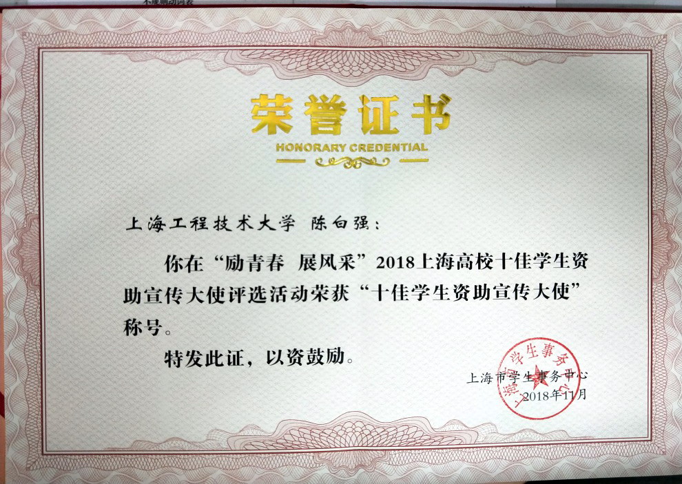 11月25日,由上海市教委指导、上海市学生事务中心主办的“励青春展风采”——首届上海高校十佳学生资助宣传大使颁奖典礼在上海戏剧学院举行。机械与汽车工程学院2017级本科生陈白强代表学校参与了此次评选活动,并获评委的一致肯定,成功入选首届上海高校“十佳学生资助宣传大使”。