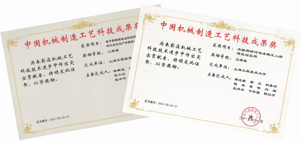 日前,我校工程实训中心的两项科研成果分别获得中国机械制造工艺科技成果二等奖和三等奖。以徐新成教授领衔的课题组研发的“基于精密塑性成形的锌制零件节能节材工业化生产关键技术开发与应用”项目获得二等奖,以黄立新副教授领衔的课题组研发的“水陆两栖河道清理无人船研发与应用”项目获得三等奖。