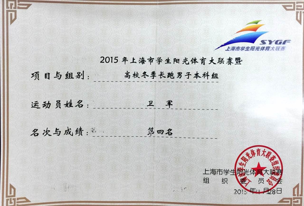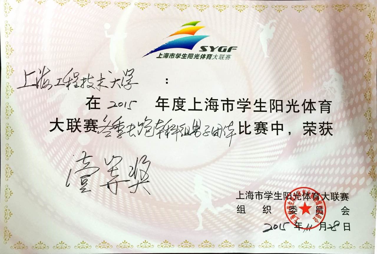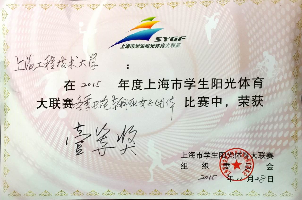 11月28日举行的2015年上海市学生阳光体育大联赛(高校组)冬季长跑比赛中,我校男女长跑队双双夺得一等奖,卫军同学获得个人第四名。该赛事由上海市教委、上海市体育局和共青团上海市委共同主办,上海第二工业大学承办。共有38个高校参加,其中本科组27个。