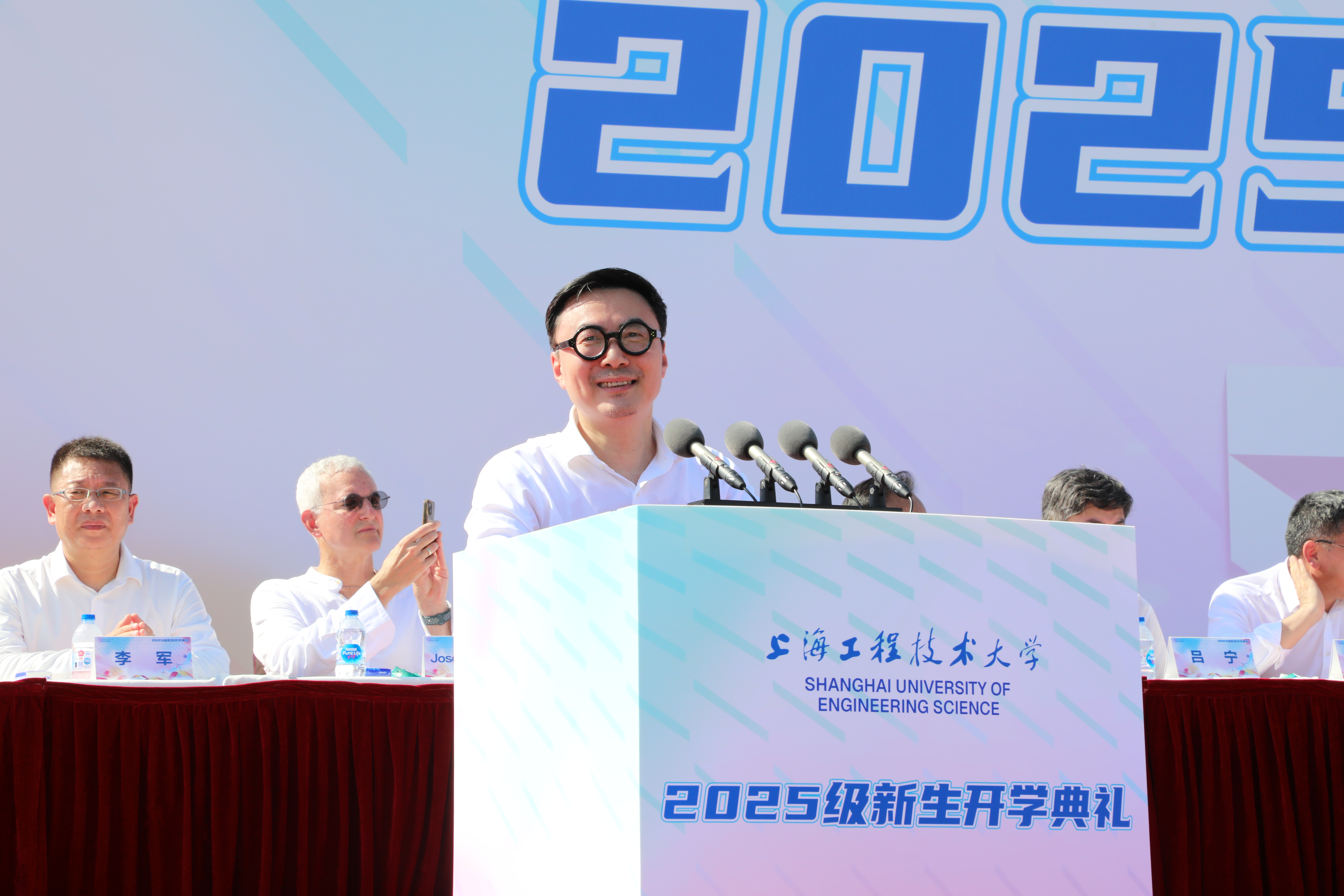 校党委书记李江,校长娄永琪,党委副书记朱晓青,党委副书记、纪委书记孟星,党委副书记、副校长徐阳,副校长王岩松、夏春明、许开宇,校领导史健勇等出席开学典礼。学校相关职能处室负责人、各学院党政负责人、校友代表、教师代表、承训教官以及全体2025级新生参加活动。徐阳主持开学典礼。