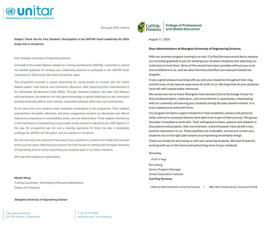 在扎实推动国内实习的同时,学校产学合作教育中心有序开展境外合作教育,组织学生分赴美国、新加坡和日本参与“名校进名企”及“联合国SDGs研学”等项目。同学们在跨文化环境中表现出优秀的学习能力与团队协作精神,获得联合国训练研究所(UNITAR)、美国加州州立理工大学波莫纳分校等国际机构的高度认可和来信赞扬,展现了我校学子的国际视野与综合素养。
