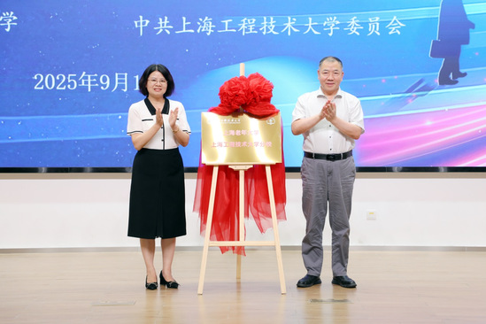 朱晓青与王松华为“上海老年大学上海工程技术大学分校”揭牌
