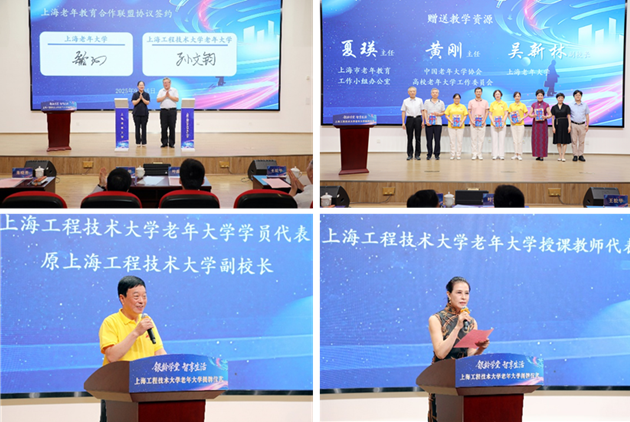上海老年大学副校长褚沁与党委离退休工作部部长、老年大学副校长孙文钧签署上海老年大学与上海工程技术大学老年大学合作联盟协议。黄刚、夏瑛和上海老年大学副校长吴新林共同为学员代表赠书,进一步丰富老年大学的教学资源。学员代表陈力华、授课教师代表汪涵煦分别分享了在老年大学学习与教学的体会与感悟,表达了对老年教育事业的深厚情感与坚定信心。