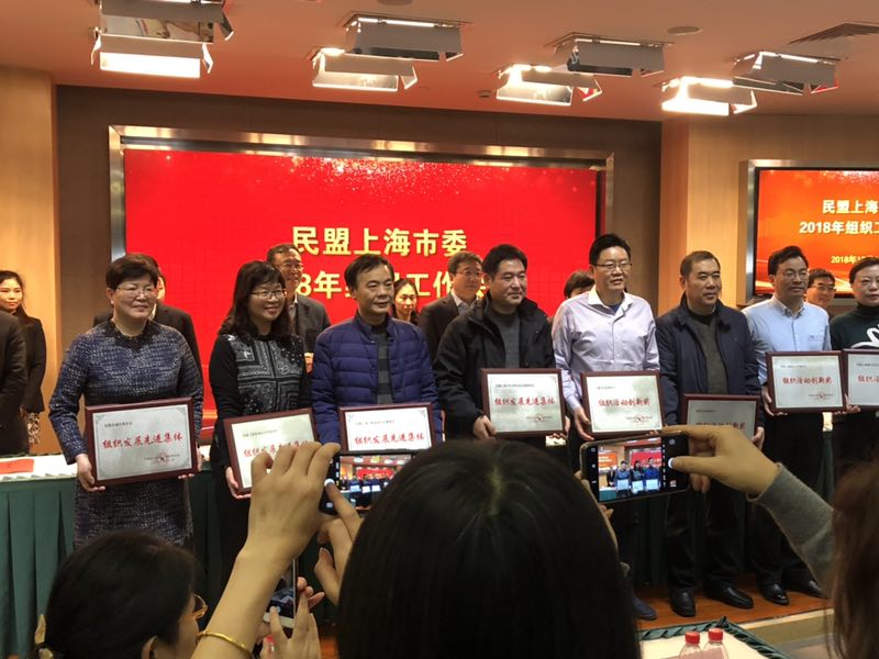 会上,盟市委表彰了2016—2018年度先进集体、先进个人,民盟上海工程技术大学委员会获得了组织发展先进集体称号, 朱翔和黄新祥两位盟员获得了2018年度中国民主同盟上海市委员会组织工作先进个人荣誉。