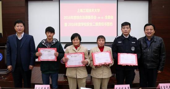 会议还宣读了“2015年度拾金不昧奖”名单,校领导为获奖人员代表颁奖。化学化工学院、工程实训中心、信息办公室、后勤实业发展中心等四个部门的负责人作为代表,与校党委书记、综治委主任李江进行了2016年度学校综合治理二级责任书签约递交仪式。