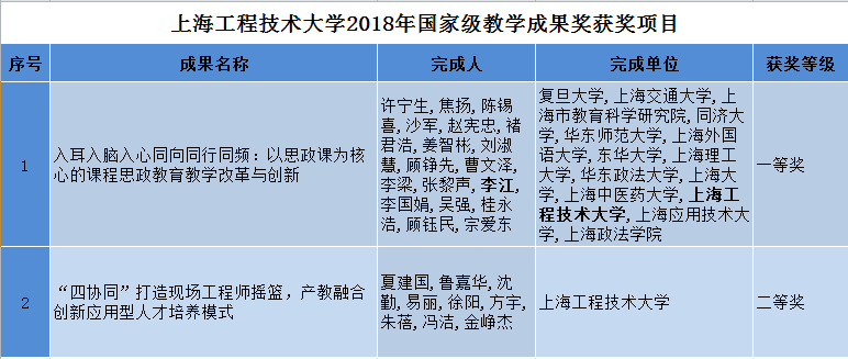 近日,教育部下发了《教育部关于批准2018年国家级教学成果奖获奖项目的决定》(教师〔2018〕21号),并公布了获奖名单。我校共有2项教学成果获奖(其中一项为联合申报)。其中,我校与复旦大学等单位联合完成的教学成果《入耳入脑入心同向同行同频:以思政课为核心的课程思政教育教学改革与创新》被评为2018年高等教育国家级教学成果奖一等奖。我校独立完成的教学成果《“四协同”打造现场工程师摇篮,产教融合创新应用型人才培养模式》被评为2018年高等教育国家级教学成果奖二等奖。