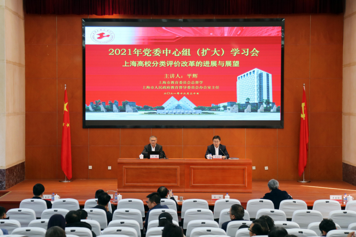 12月30日下午,学校在行政楼B301会议室召开党委理论学习中心组(扩大)学习会,特邀上海市教育委员会总督学、上海市人民政府教育督导委员会办公室主任平辉作《上海高校分类评价改革的进展与展望》专题辅导报告。校党委中心组成员、中层干部参会,会议由副校长王岩松主持。