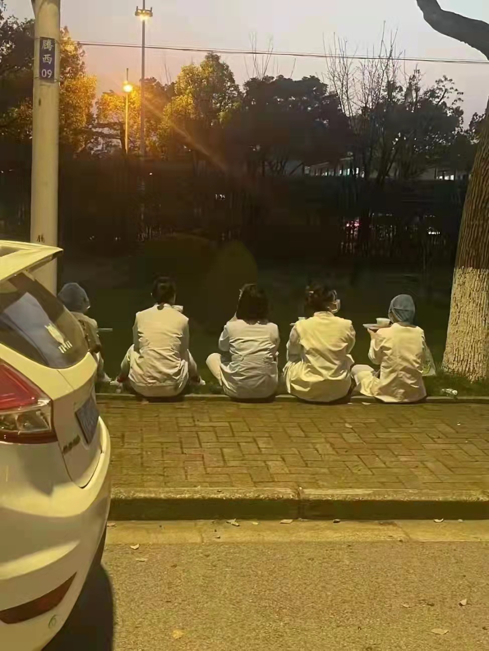 这是让所有工程大人破防的一幕:夕阳西下,华灯初上,辛勤工作的医护人员,为了减少交叉感染的危险,坐在户外的台阶上吃晚饭。