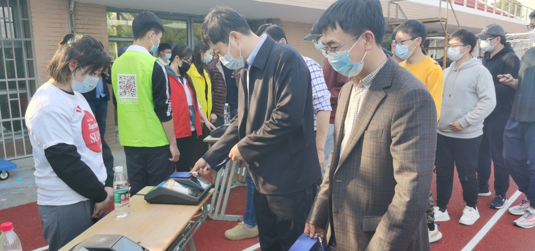 3月11日下午2点,检测工作开始后,校党委书记李江,党委副书记、校长俞涛,党委副书记、工会主席史健勇,副校长姚秀平来到检测现场与师生一起排队,进行检测。同时叮嘱大家要科学防护,并要求相关部门做好服务保障工作。