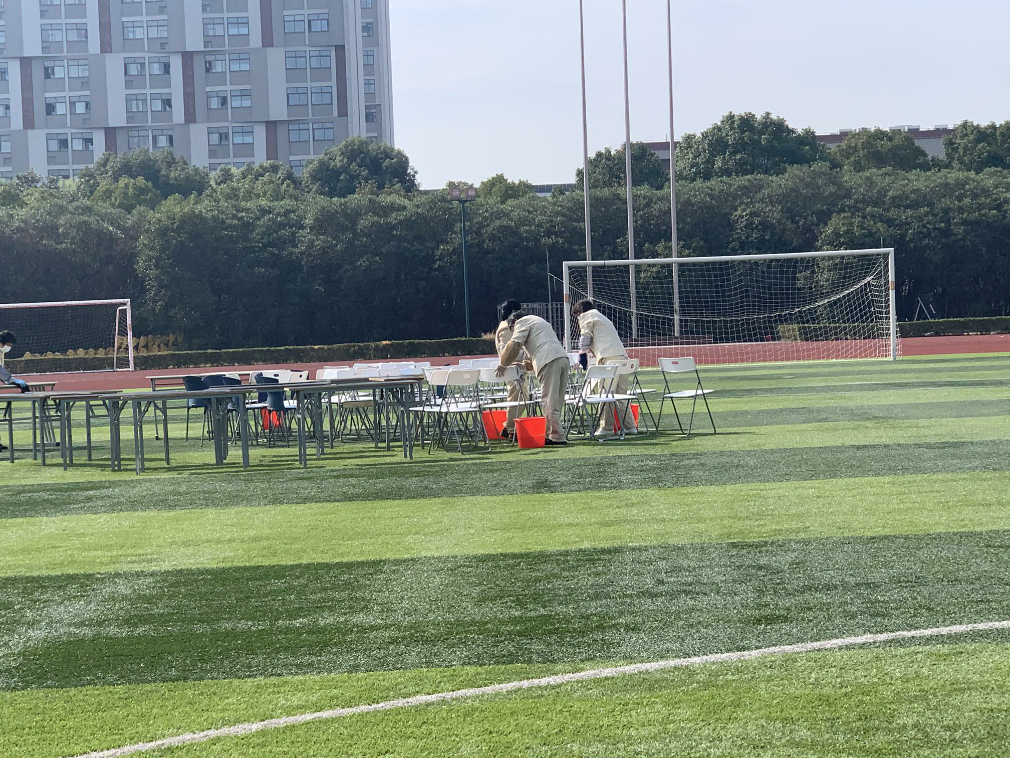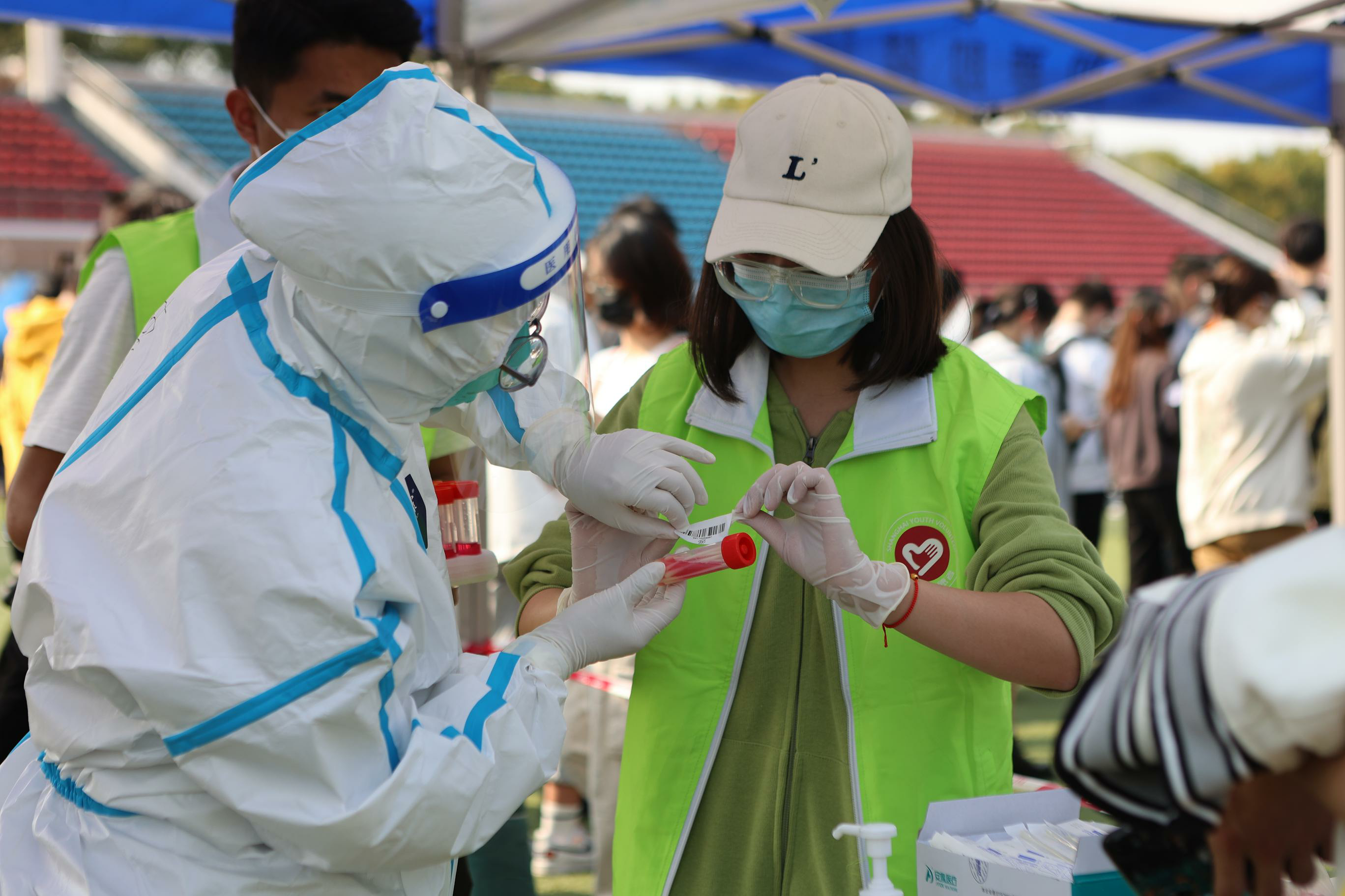 校团委迅速集结一支150人的服务队伍,志愿者们穿梭在西操场的各个角落,协助医务人员开展工作,搬运物资,引导队伍,为有困难的师生提供帮助,各项工作有条不紊。