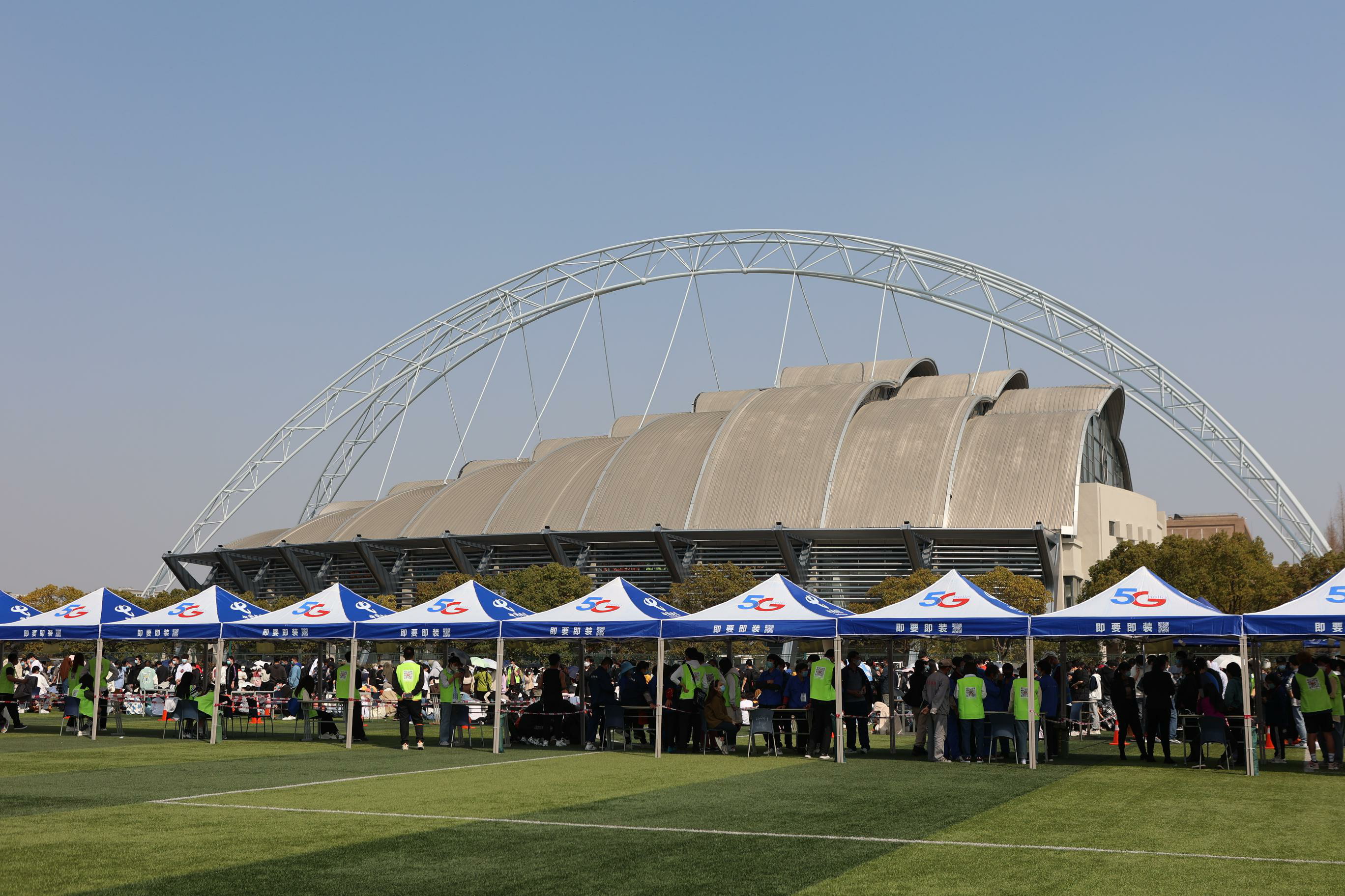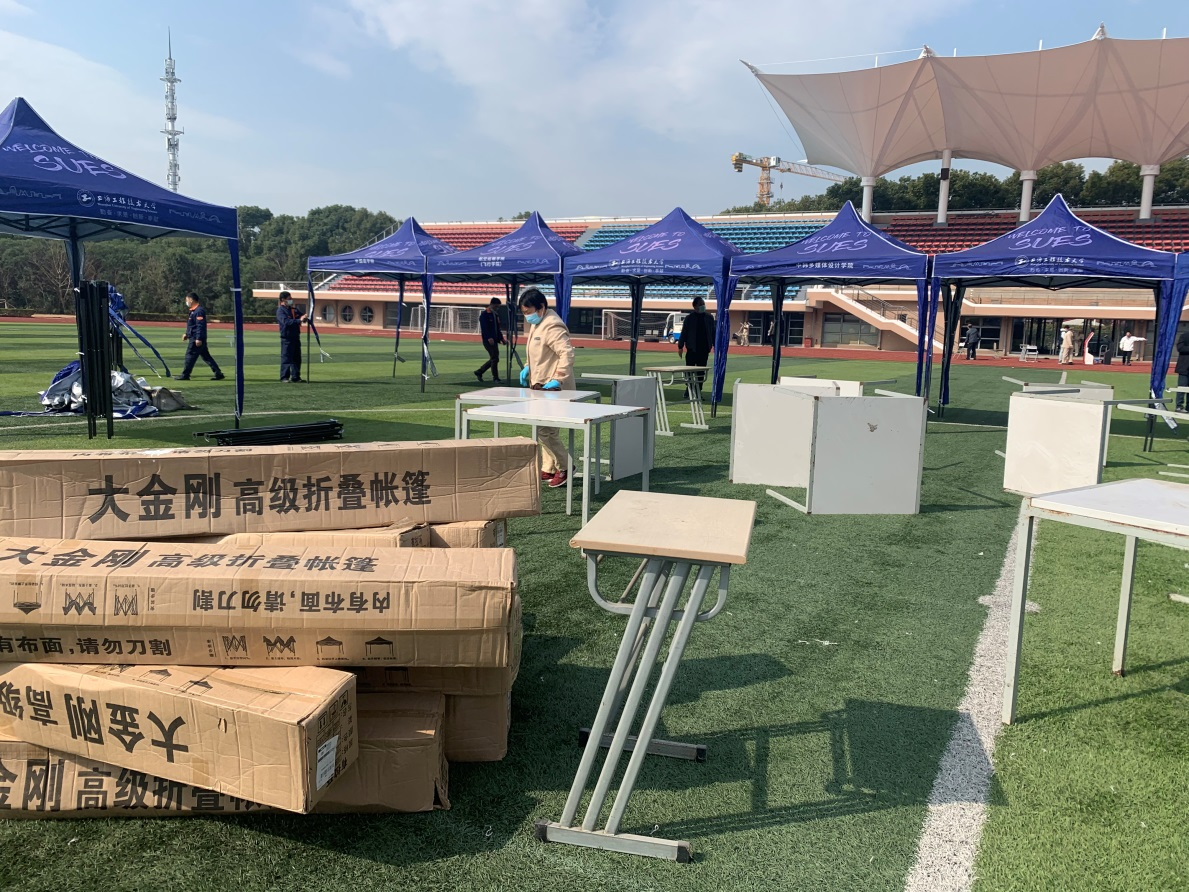 3月11日清晨,后勤实业发展中心的工作人员到达西操场,通过搭建帐篷、摆设桌椅、设置隔离线,布置完成60组核酸检测动线。信息办的老师们也在统一出入口安装刷卡机,并进行网络测试,确保信息传输畅通。