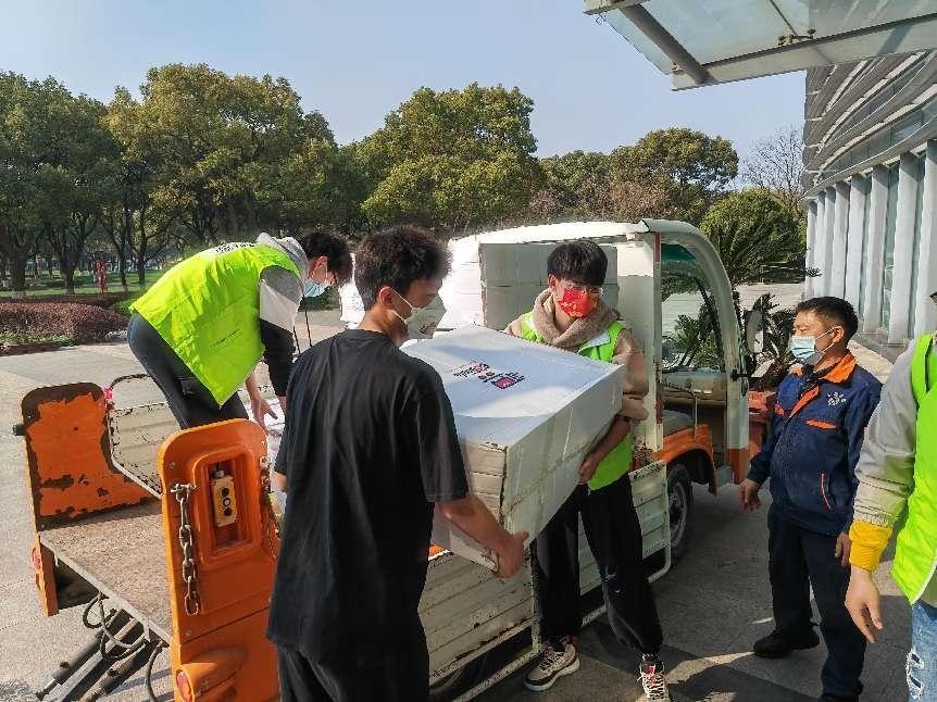 3月14日清晨,20余名青年志愿者来到行政楼前,协助搬运学校防疫物资,此批物资是工会为学校师生员工购置的防疫行军床与睡袋。天气气温较高,志愿者们的汗水不停流淌在脸颊,但志愿者们并没有一句怨言,来回在搬运点和学校教工之家。物资较多,体积也较大,志愿者们分工协调,卸载货物、平板车运送、整理摆放,工作井井有条、高效有序。志愿团队负责同学叶仪婷说:“很荣幸能够参与学校疫情防控工作,自己的力量是有限的,但是那么多同学一起加入志愿服务队伍,我们就一定能凝聚起磅礴的力量!”