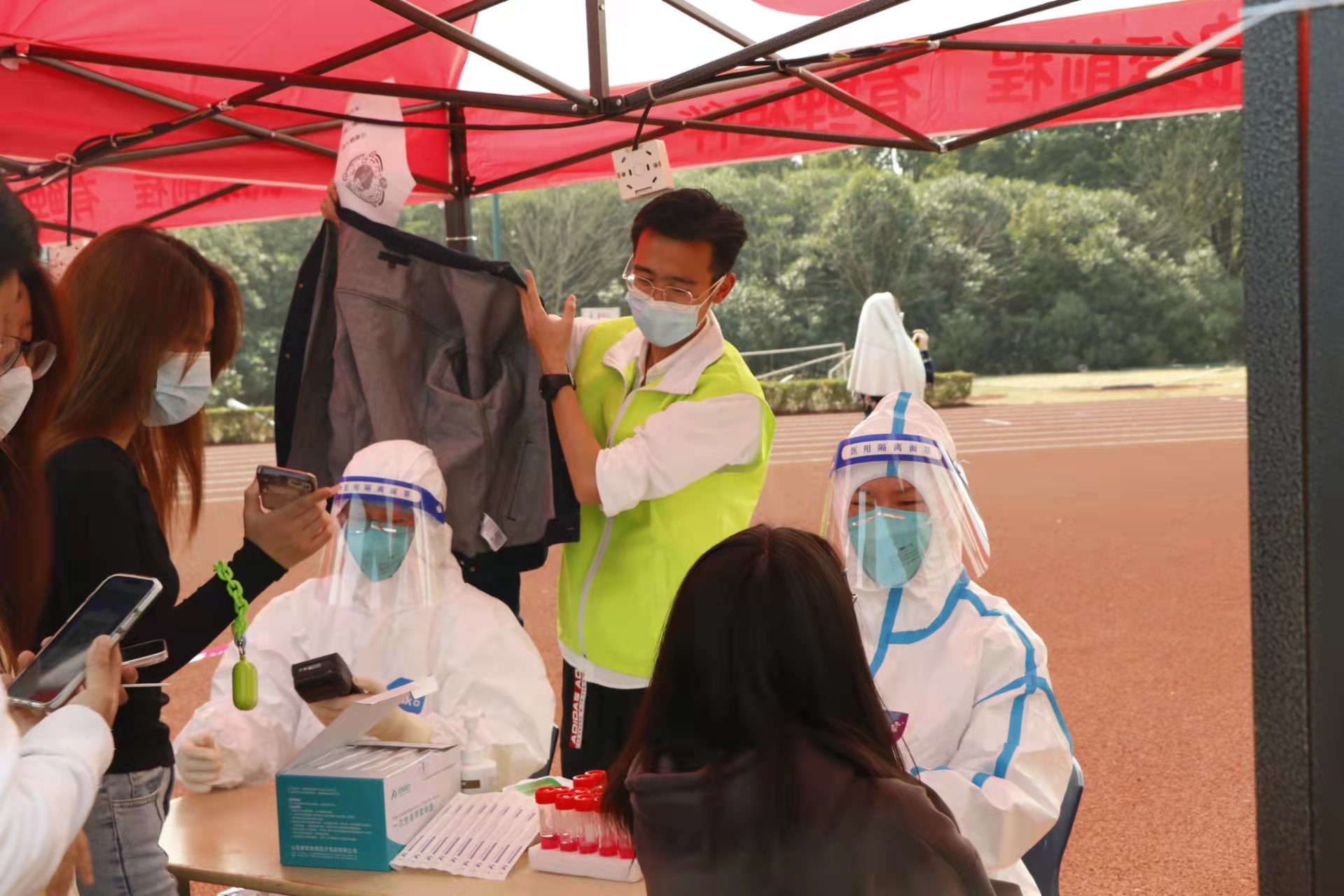 “大白们一到现场就立刻开始了核酸检测工作,防护服又闷又热,很是辛苦。由于背光,扫码机器时不时会出现难以扫录的问题,大大影响了检测速度。核酸检测工作刻不容缓。于是,毫不犹豫,我脱下外套,为医护人员撑起一片阴凉,尽量不让温度和强光对于检测产生太多影响。作为校团委的学生干部,我认为参加防疫工作是本分,哪里需要,哪里就冲锋在前!”