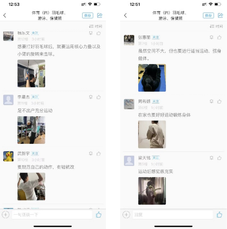 体育教学部组织教师针对体育课程的内容和形式特点,重新安排教学计划和教学进度,以理论讲解、运动技能动作视频分析和基础体能训练等相结合的方式,调整教学内容和教学方法以适应线上体育课程的新要求。教师们根据教学安排自身特点,选择超星、腾讯会议和微信群直播等方式一课一策开展运动技能和理论教学,以学生录制小视频、开摄像头现场直播锻炼等形式保障了线上体育教学的质量。