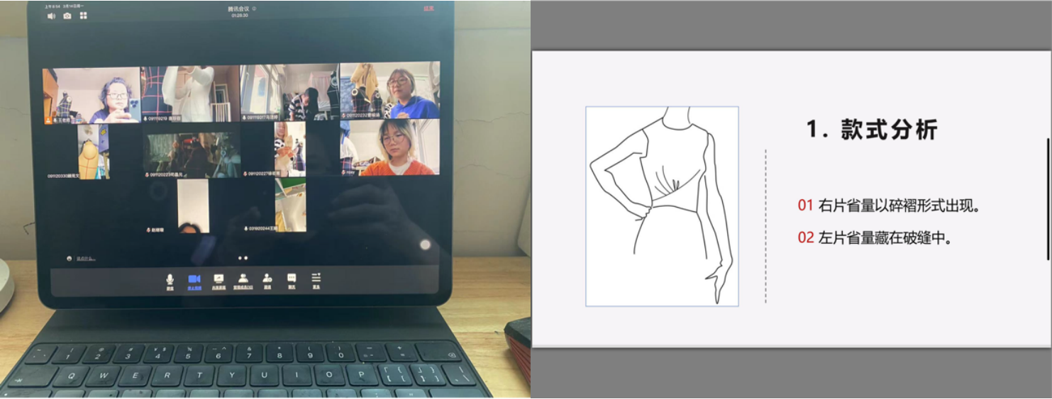 纺织服装学院服装设计与工程系王燕珍老师的“立体裁剪基础”课程,线下教学通常以教师示范讲授为主,训练学生的造型能力和实践能力。针对线上教学存在的限制,王老师采用了教师讲授与学生汇报相结合的形式。采用多元化交流互动的课堂形式,突破传统的单一空间授课模式。同时突破实践环节课堂演练的定式,根据学生的实时操作手法及方式,根据学生自身特点,有针对性地指导学生的实际操作过程。