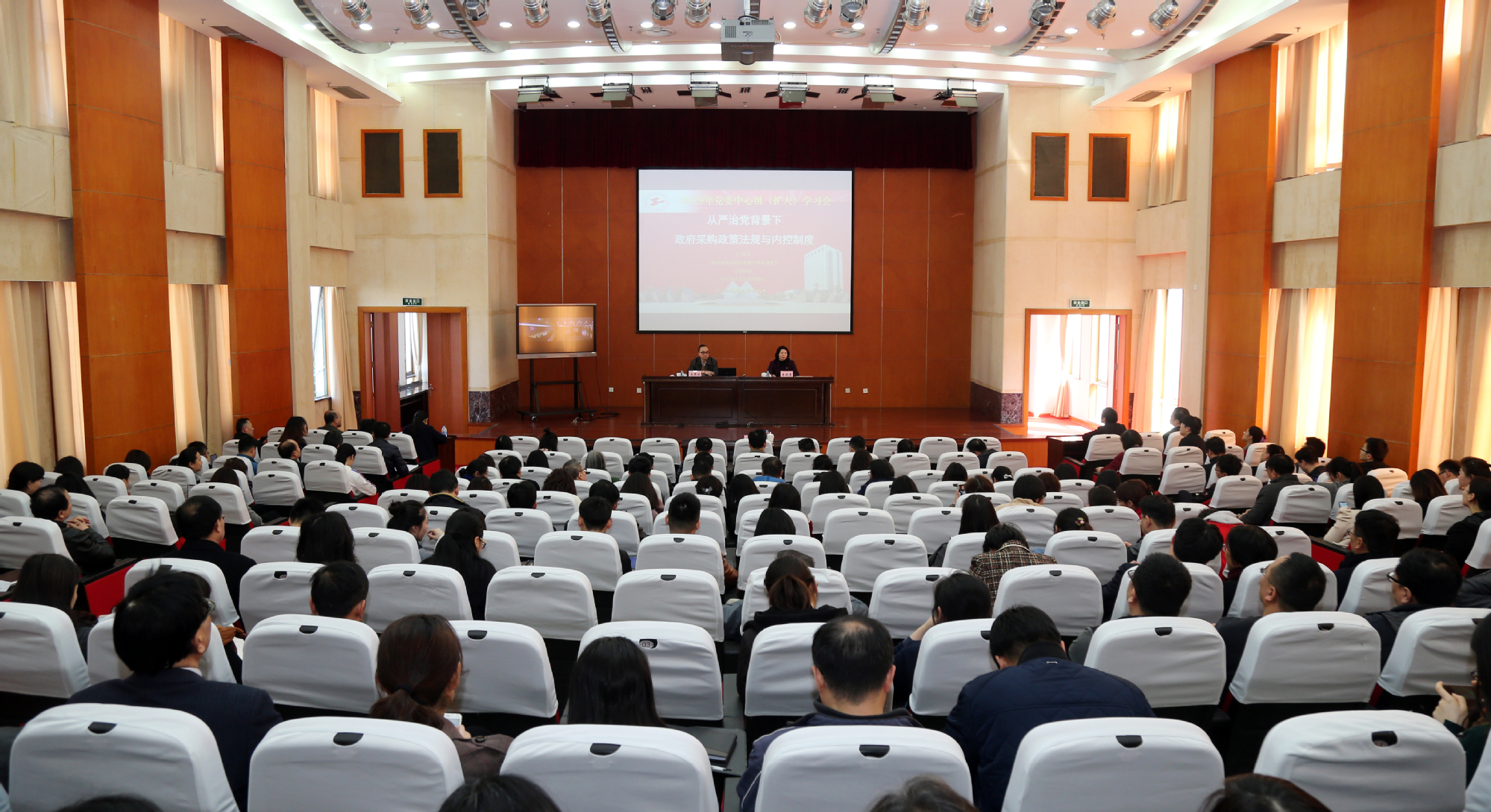 为深入贯彻落实全面从严治党工作会议精神,牢固树立“四个意识”,坚定“四个自信”,落实市委巡视整改要求,把从严治党融入政府采购工作的全过程,不断完善内控制度建设,3月19日下午,校党委中心组在行政楼B301会议室举行专题学习会,上海市财政局政府采购管理处副处长、公职律师、华东政法大学兼职教授王周欢就“从严治党背景下政府采购政策法规与内控制度”作专题辅导报告及相关政策解读。中心组成员、中层干部、支部书记、机关科级以上干部、辅导员200余人参加了会议,党委副书记、副校长朱晓青主持会议。