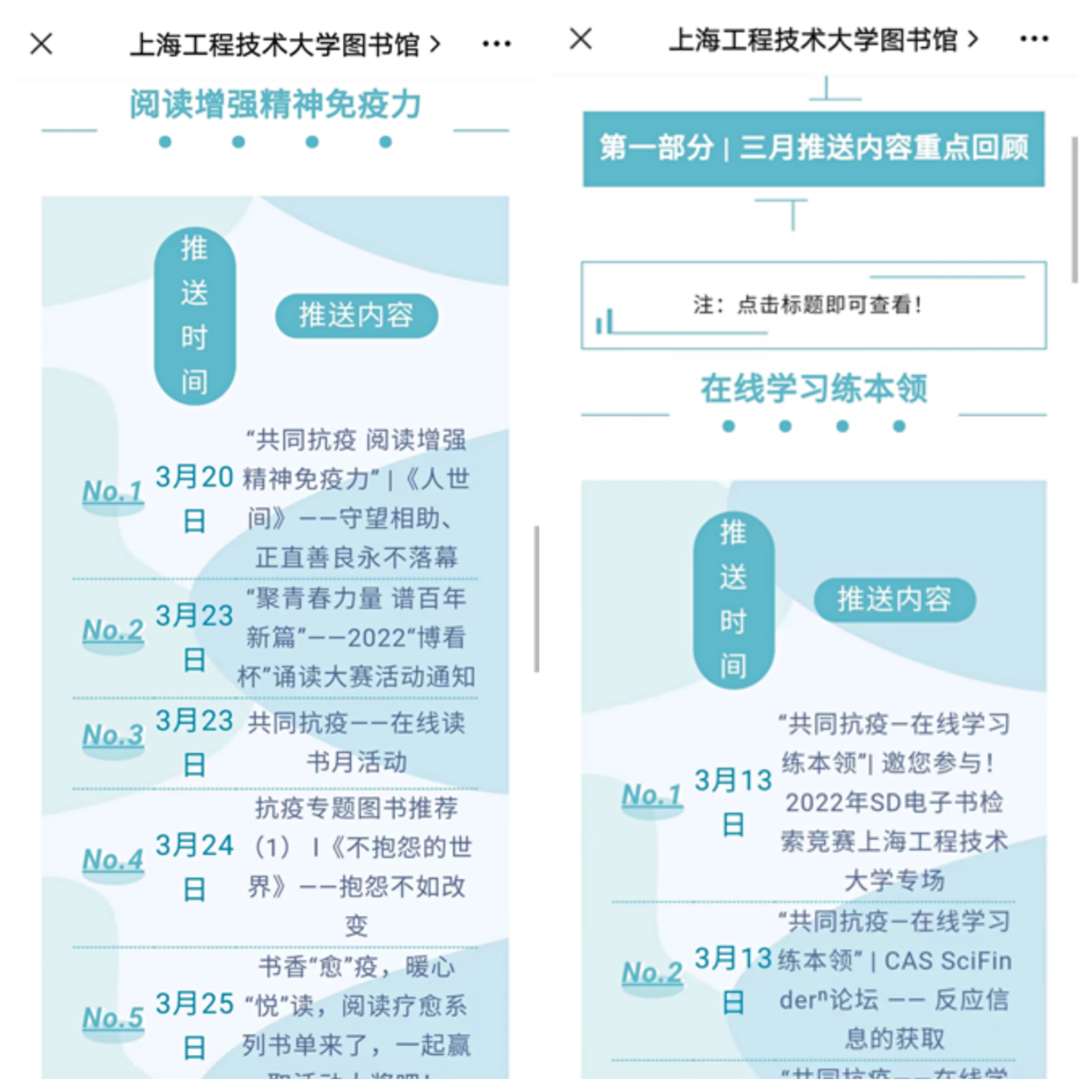 疫情防控需要科技力量的强力支撑,也离不开及时跟进的人文关怀和精神激励。为丰富抗疫期间师生读者的精神文化生活,图书馆开展“共同抗疫——在线读书月”活动;开列阅读疗愈系列书单、切合影视热点和现实需要先后推送荣获茅盾文学奖的长篇小说《人世间》,以及《不抱怨的世界》等弘扬正能量、振奋精神的优秀著作;积极策划组织在校学生参加由上海图书馆学会主办的“聚青春力量 谱百年新篇”——2022博看杯诵读大赛,在线开展“错彩初发,君自何朝?” —— Emerald 2022 美学与名画趣味竞赛等活动。