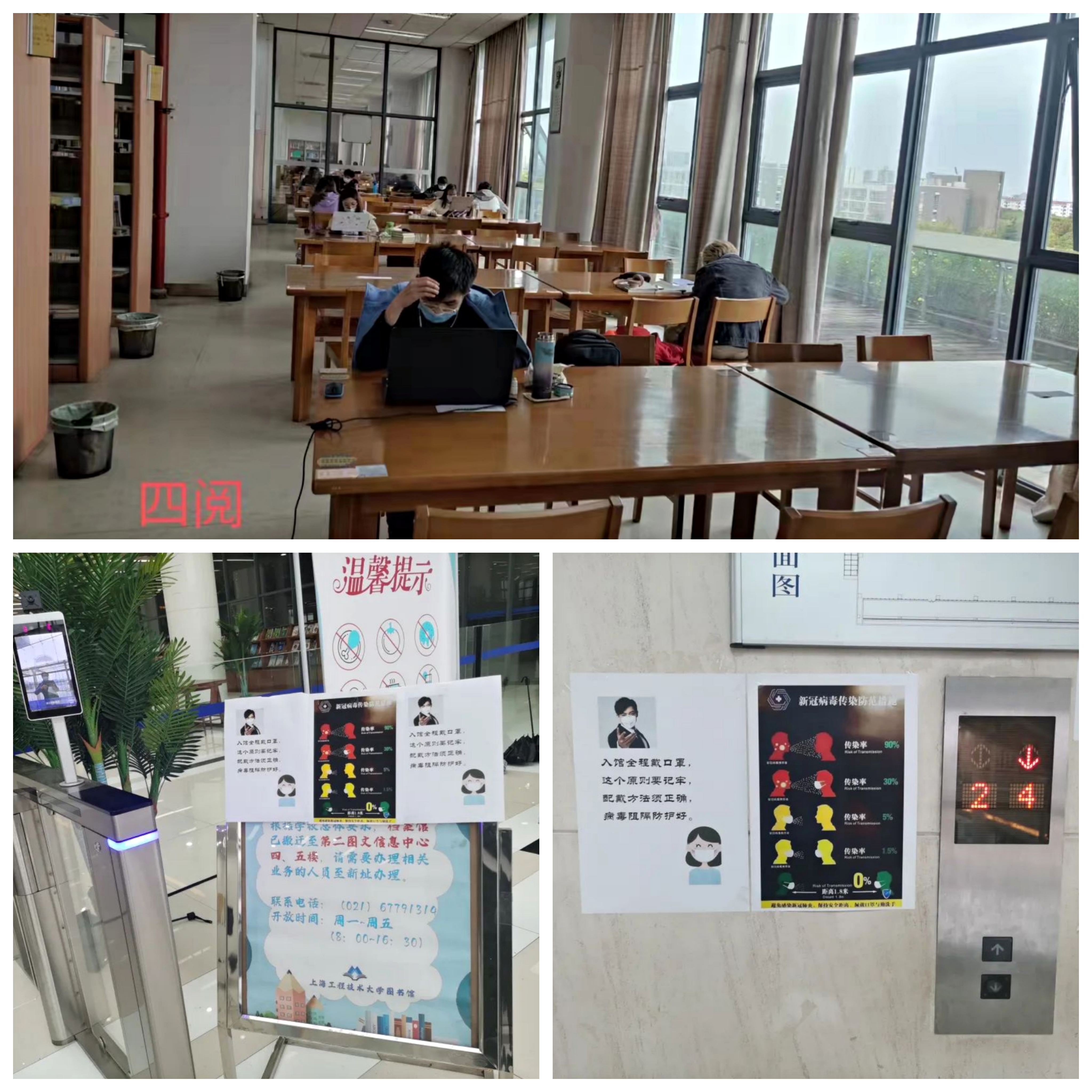 为更好地在特殊时期服务好读者,图书馆党政班子成员留校值守,带领流通岗的老师们勇挑重担、冲在一线,在严格贯彻落实学校疫情防控管理要求的同时,合理开放馆内空间尽力满足读者需求。第一时间制作馆内防疫宣传标识,现场督查提醒入馆读者全程规范佩戴口罩;流通部按防疫管理的实际需要及时调整开放方案,尽可能满足读者线下借阅、进馆学习等多种需求;技术部同步对第一图文信息中心二楼闸机系统的开放和关闭、信息共享空间和座位系统的设置与开放、汇文文献信息系统的借还书时间等做出及时调整,保障开放方案的技术实现,同时积极推进数字图书馆系统建设项目。