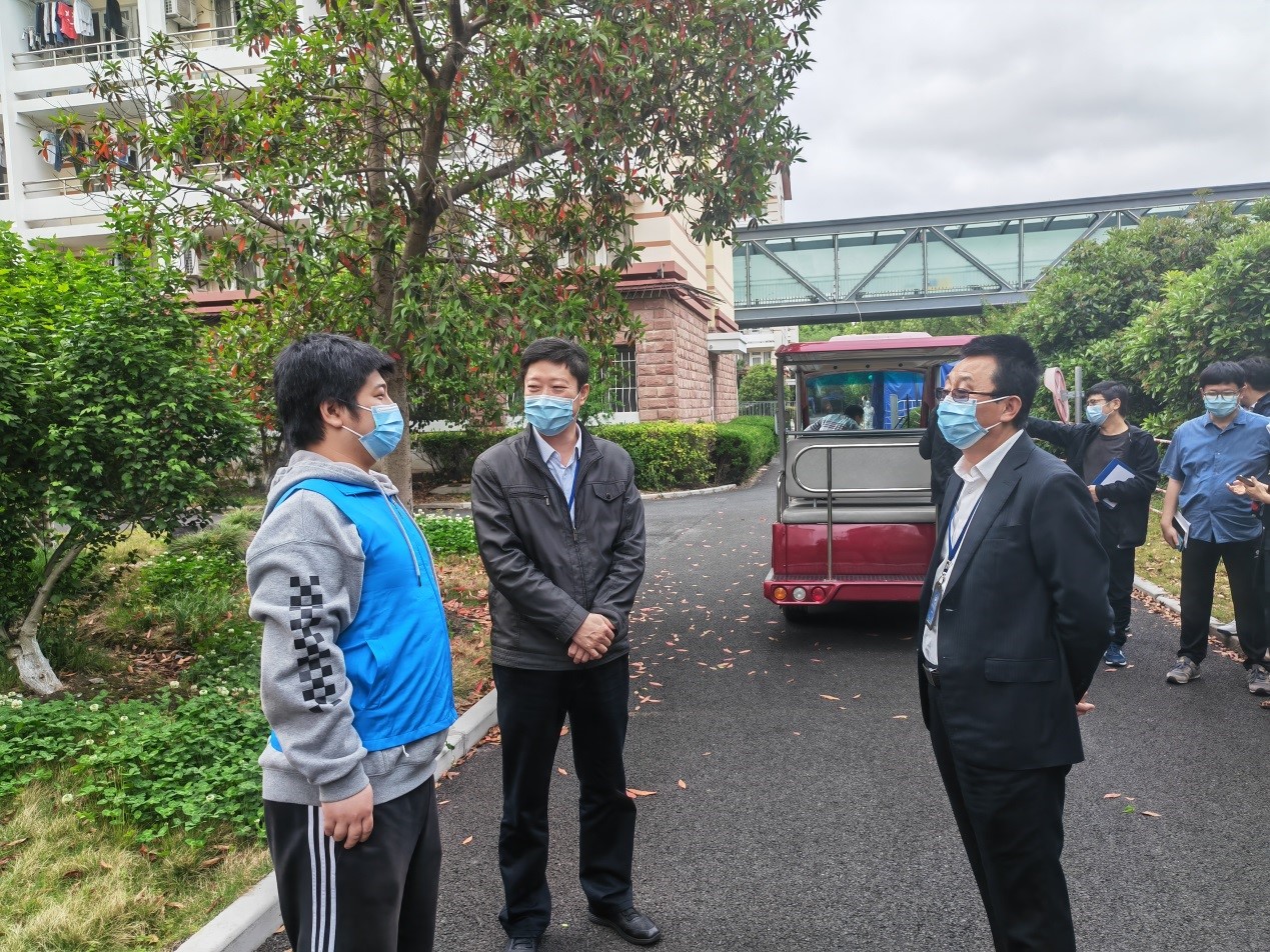 在学生宿舍区,校领导看望了正在开展校园巡逻的学生志愿者,详细询问了志愿者们的工作和学习情况,对大家投身学校疫情防控、主动担当作为的精神表示赞赏。鼓励同学们在特殊时期,积极调整心态,合理安排时间,提高学习效率,与学校团结一心,共克时艰。
