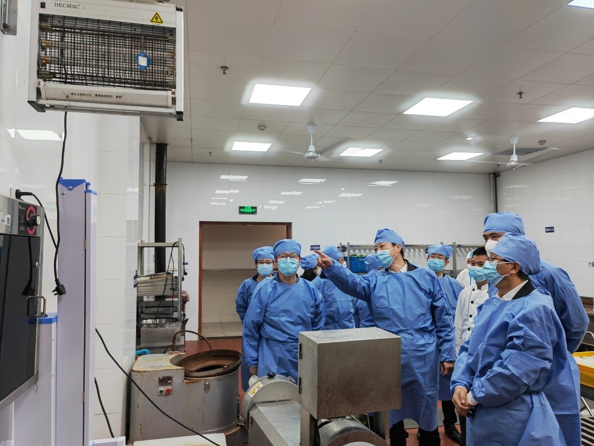 在第二食堂,校领导一行查看了食堂供应窗口、配菜通道以及储藏冷库,对后勤部门和员工在校园疫情防控期间坚守岗位、无私奉献的精神表示肯定。要求在食堂物资严格消杀到位的前提下,进一步严格规范餐饮的烹饪、分装、运送等各环节,务必保障好校内餐饮的安全、供应量和标准,不断提高师生的满意度和幸福感。