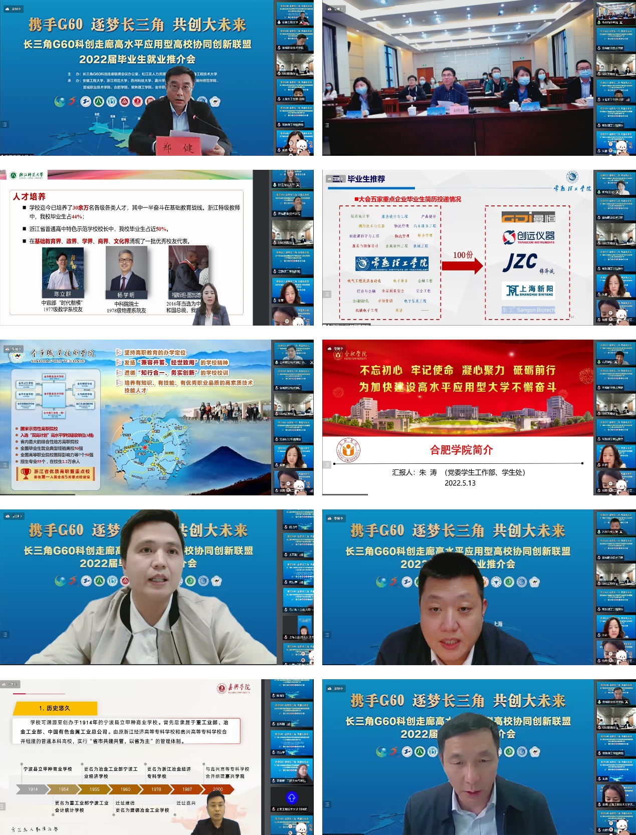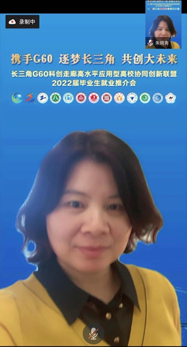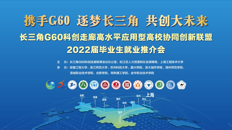 为深入贯彻党中央、国务院“稳就业”“保就业”决策部署,积极发挥长三角G60科创走廊九城协同发展优势,抢抓当前毕业生就业冲刺期,更好推进联盟高校就业工作。 5月13日下午,“携手G60 逐梦长三角 共创大未来”长三角G60科创走廊高水平应用型高校协同创新联盟2022届毕业生就业推介会在“云端”顺利举办。本次活动由长三角G60科创走廊联席会议办公室、松江区人力资源和社会保障局以及我校联合主办,安徽工程大学等10所联盟高校协办。