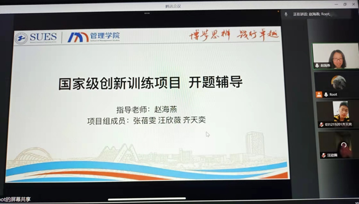 近日,管理学院赵海燕老师对所指导的2022年国家级大学生创新训练项目进行了在线开题辅导。一方面是帮助同学们在项目之初就形成清晰的思路以顺利推进项目的执行,另一方面关心学生疫情期间在家或在校学习的状态并帮助学生做好心理建设。