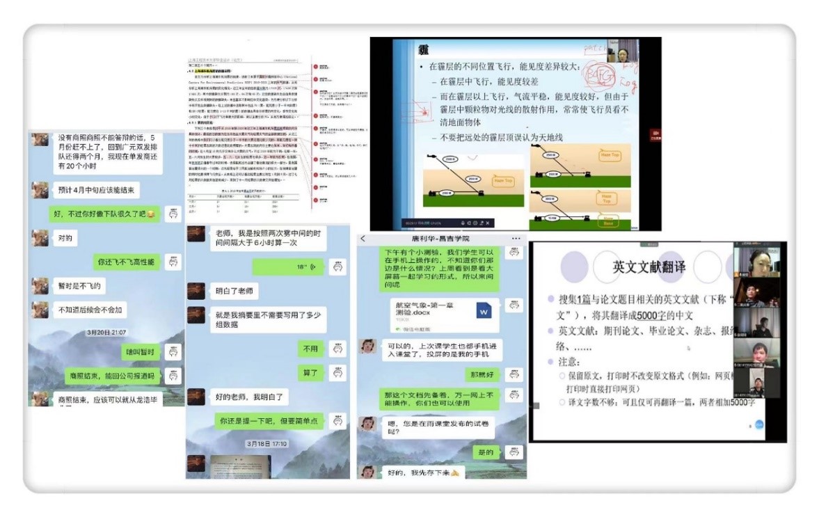 作为飞行技术教学团队的一名学业导师,课业指导之余,顾老师经常与远在他乡训练的学生进行交流,及时掌握他们的学飞进度,同时关心他们的毕业论文进度。他们会告诉顾老师飞行训练过程中的开心事儿,也会吐槽遇到的“坎儿”。顾老师及时给予鼓励或批评,并提出自己的见解和建议。顾老师常开导他们从不同角度思考遇到的问题,收敛脾气和性情,直面和解决问题。顾老师还有一群特殊的、未曾谋面的学生,但他们依旧每周三在新疆昌吉学院的教室里,与我校学生共同云学习。通过对方联系人唐老师,顾老师主动了解学生水平、师资状况、课程教学安排等。虽身处异地,但云学习让他们走到了一起,两校师生正共同探索支援西部云上教学的新模式。