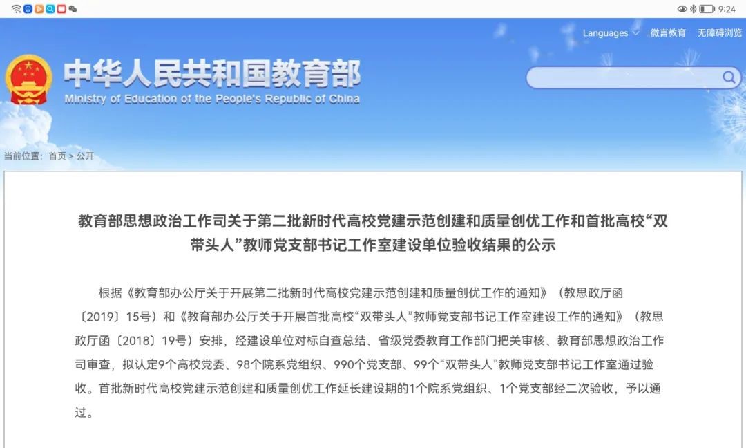 5月24日,教育部思想政治工作司发布了《关于第二批新时代高校党建示范创建和质量创优工作和首批高校“双带头人”教师党支部书记工作室建设单位验收结果的公示》,对通过验收的9个高校党委、98个院系党组织、990个党支部、99个“双带头人”教师党支部书记工作室进行公示。
