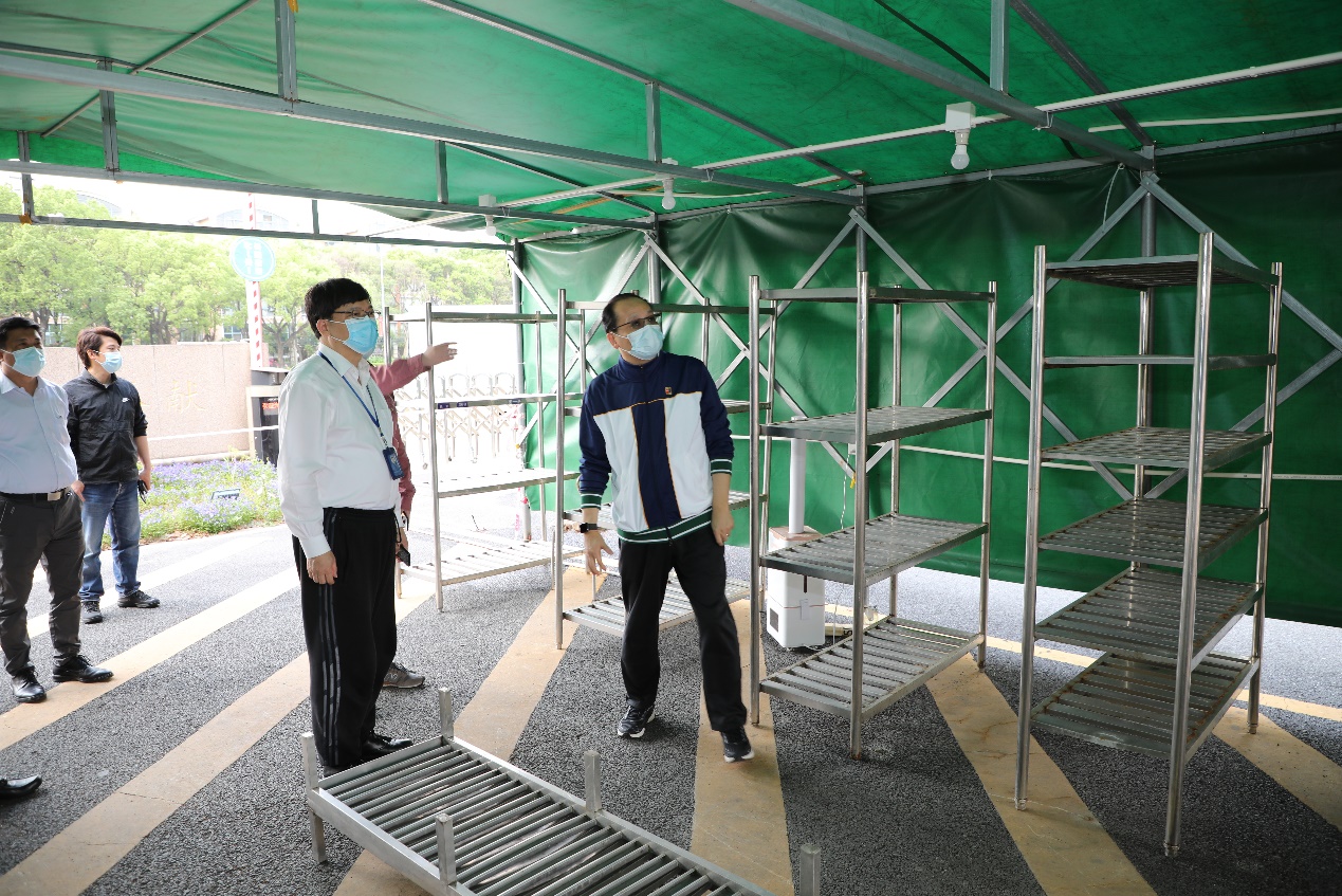 5月25日下午,校党委副书记、校长俞涛,副校长夏春明一行实地检查了松江校区疫情防控工作,重点检查了大件快递寄递点的运行情况和新购快递取件点的准备工作。校长办公室、保卫处、后勤实业发展中心等部门负责人参加检查。