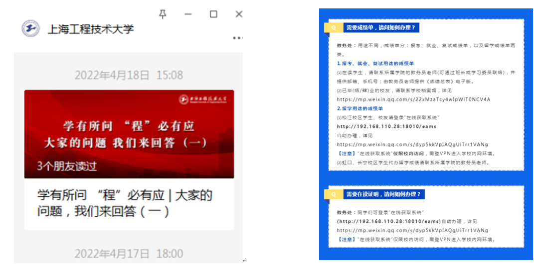 优化服务,及时响应师生关切。教务处通过例会、专题工作会及交流,通过教学副院长、教务员建立与院部以及处内教师的常态联络机制,掌握师生在线教学、课程考核、全程导师等工作中遇到的各种问题,及时沟通解决。设立了“在线值班室”腾讯会议号,每天在线值守,解答学生疑问,做好咨询服务。设置了办公电话呼叫转移,并将会议号、值班电话通过微信群组由教务员、教学秘书向各院(部/中心)公布,通过公众号进行推送。对师生关切、经常办理的各事项,除通过常规渠道推送、传达外,借助学校官微、校团委公众号等途径,适时开展信息发布。