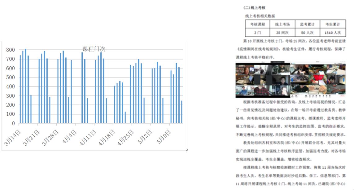 多措并举,落实线上教学服务。教务处制定疫情防控期间在线教学实施方案,有序推进教育教学工作,确保教师正常开展教学,确保每一位学生都能顺利完成疫情防控期间的课程学习。通过超星线上教学平台培训、超星线上考试平台培训等各类线上教学培训,帮辅师生顺利进行线上教学。同时,开发了“在线教学平台”功能,方便师生对接课程信息。每日巡查线上教学情况,每日汇总、整理并发布教师课程线上教学信息,累计达26287门次。实行教学平台数据“一日一报”,线上教学总体情况“一周一报”制度等,已编辑日报31期、周报13期,内容涵盖线上教学情况、线上考核情况、教学服务、学籍管理、线上教学平台相关数据、实践教学与创新教育、教学督导专家听课情况等,完整全面地反映线上教学实时动态。