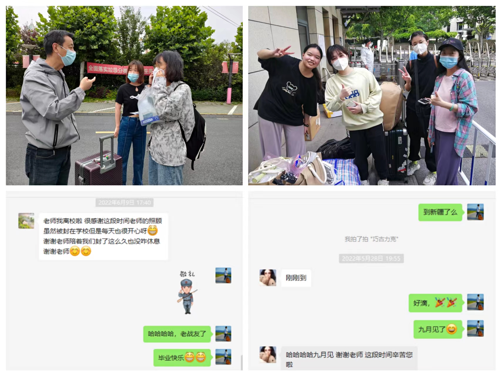 为确保每一位学生从走出校门到平安到家的全过程安全,专班老师在每一位学生离校前都会检查“五件套”(即核酸结果查验、抗原结果上传、车票信息是否有误、返乡证明材料是否齐全、离校手续是否办结),在学生出校前做到“五个一”的暖心护航(即一次离校教育、一次核酸检测、一次校门信息复核、一次抗原自测、一套防疫物资)。“谢谢老师,老师们辛苦了”,是专班老师听到最多的一句话。道别之时,同学们言语间满是感激和归家的欣喜,还不忘说“老师加油”。每天收到一条条的到家报平安消息,老师们心里便多一分安心。截止6月11日,长宁校区所有学生均已安全返家。