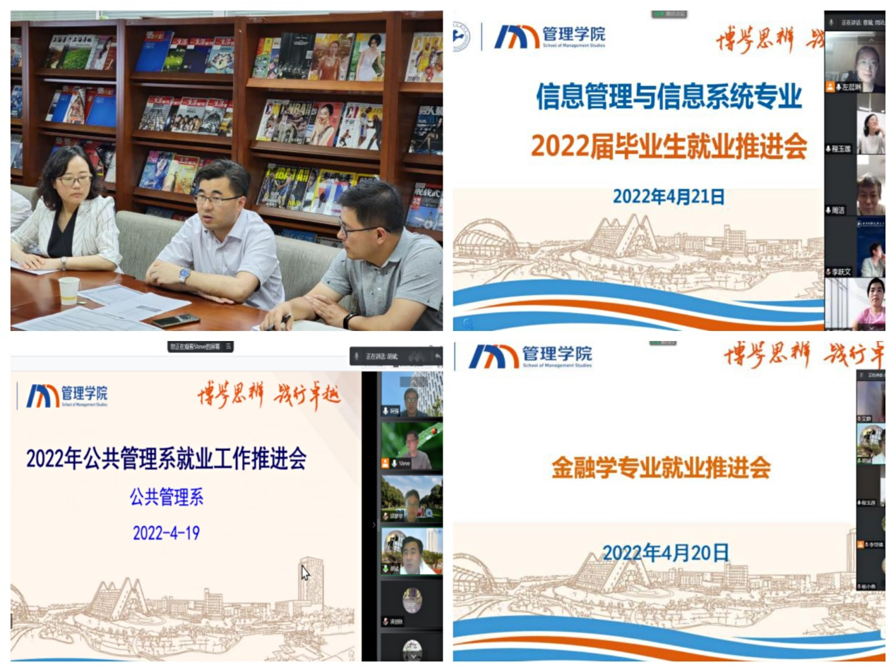 管理学院坚持守正创新,化危为机,全员动员、全程服务、全力以赴、全面推进就业工作。学院严格落实“一把手”工程,通过学院党政联席会、党委会、系主任会、教学团队会议研究推动就业工作,每周公布各专业毕业生去向落实率排名,全院上下形成就业工作一盘棋,不断夯实“就业共同体”。本学期以来,学院党委书记、院长主持召开18场专业推进会,推进就业导师“一对一”帮扶,毕业论文指导老师一对一、点对点地通过网络、电话等形式,时刻关注学生就业情况;召开16场辅导员就业专题会,讨论形势,确定方针,分类推进。每位论文指导老师根据学生实际情况填报学生就业状态,前期每月一报、中期两周一报、后期每周一报,并根据学生情况提供相应的就业指导。就业工作推进过程中,学院就业信息、就业资源及时共享,各专业辅导员和教师积极联动,学院就业凝聚力大大增强。