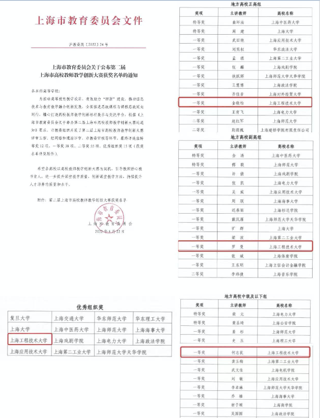 近日,由上海市教育委员会主办、上海交通大学承办的第二届上海市高校教师教学创新大赛落下帷幕。我校参赛教师团队在第二届上海市高校教师教学创新大赛中喜获一等奖三项,学校荣获优秀组织奖。