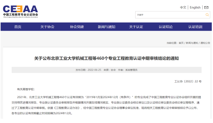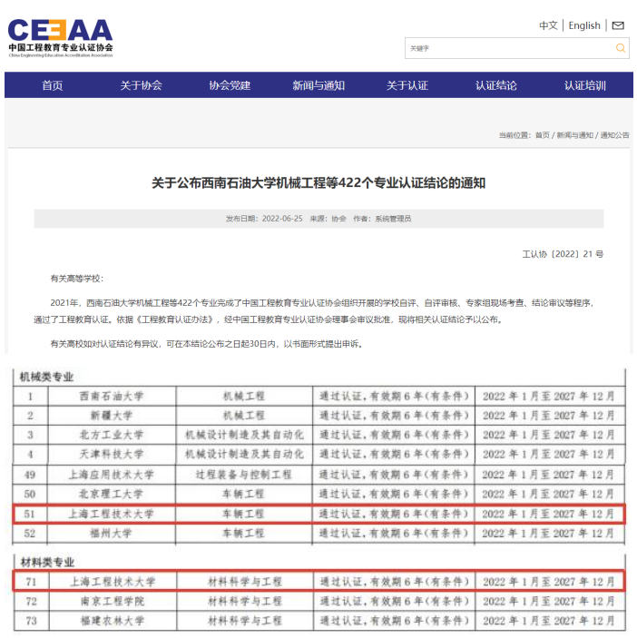 近日,中国工程教育专业认证协会正式发布2021年工程教育专业认证结论。经过专业自评、专家组现场或在线考查、分委员会审议、认证结论审议委员会审议等程序,全国高校共422个专业通过认证,我校车辆工程、材料科学与工程2个专业名列其中,认证有效期为6年;全国高校共460个专业中期审核继续保持有效期,我校化学工程与工艺、环境工程、服装设计与工程、交通运输4个专业位列其中,认证有效期为6年。截至目前,我校共有10个专业通过中国工程教育专业认证。