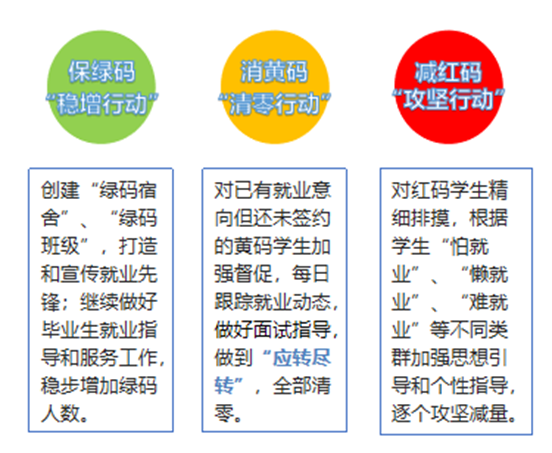 学院在对每个毕业生的就业心理和就业进展逐一精准排摸的基础上,借鉴上海市民“随申码”健康信息管理方式,创新性的采用绿、黄、红三色“就业码”对就业状况进行动态分类标记和管理。其中,“绿码”代表已落实就业的学生,“黄码”代表心态积极、并有明确目标意向或已实习的学生,“红码”则包括无就业意愿或求职面窄、“眼高手低”的学生。辅导员和导师针对“黄码”和“红码”学生“靶向发力”,分阶段实施“转绿码稳增行动”“消黄码清零行动”和“减红码攻坚行动”三大行动,逐个消除未就业的“黄码”和“红码”变量,从而实现毕业生充分就业。