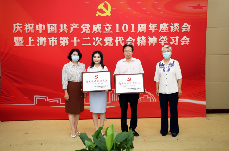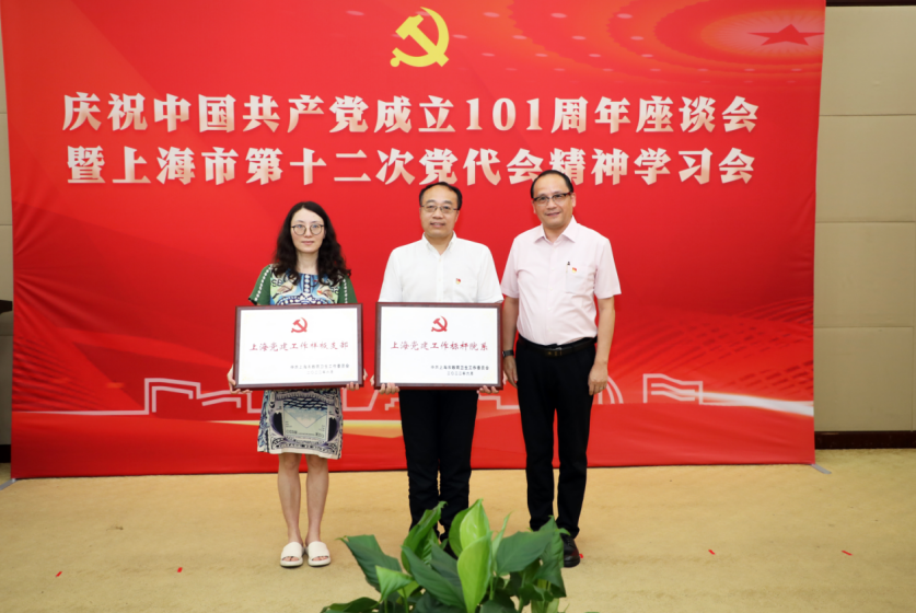 学校党委副书记、校长俞涛为电子电气工程学院党委和纺织服装学院纺织工程党支部颁发奖牌。今年上半年,上海市党建工作“标杆院系”电子电气工程学院党委和上海市党建工作“样板支部”纺织服装学院纺织工程党支部两个党组织已顺利结项。