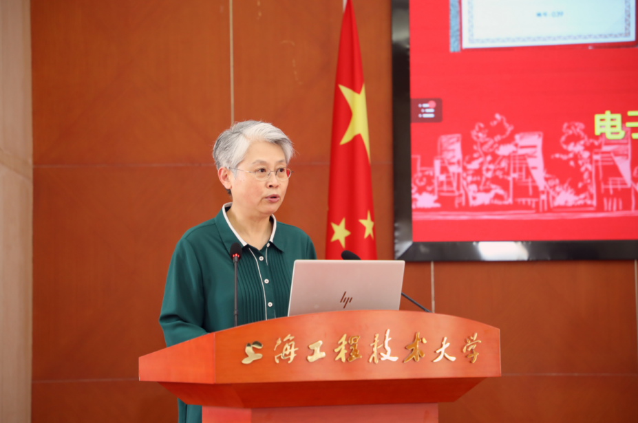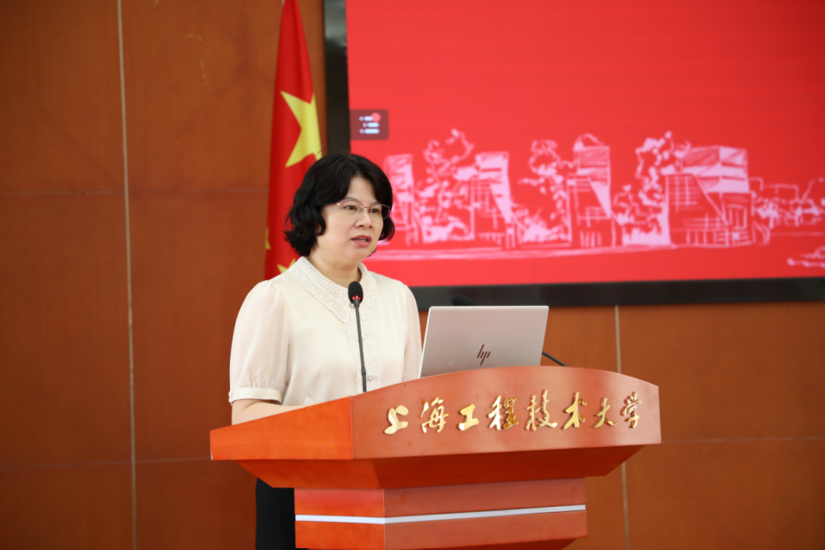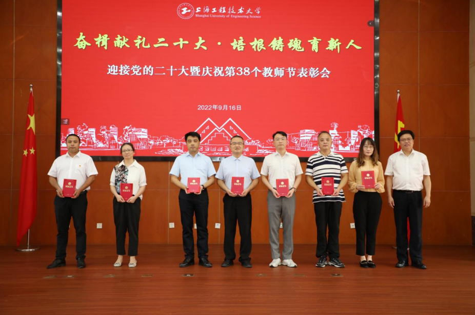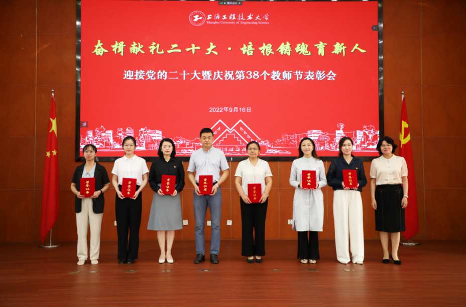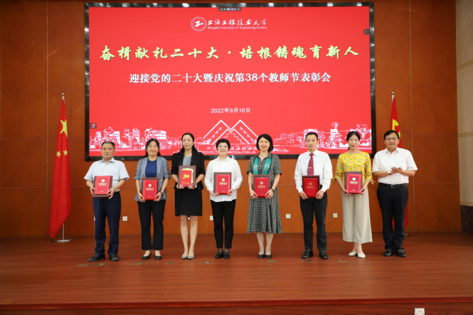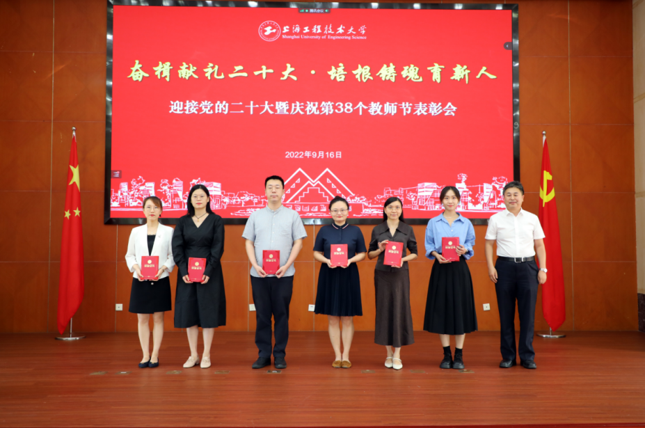 校党委副书记、纪委书记门妍萍宣读表彰决定并为第二届上海市高校教师教学创新大赛一等奖、上海市五一劳动奖章、上海市教育系统模范教工小家获奖者颁奖。