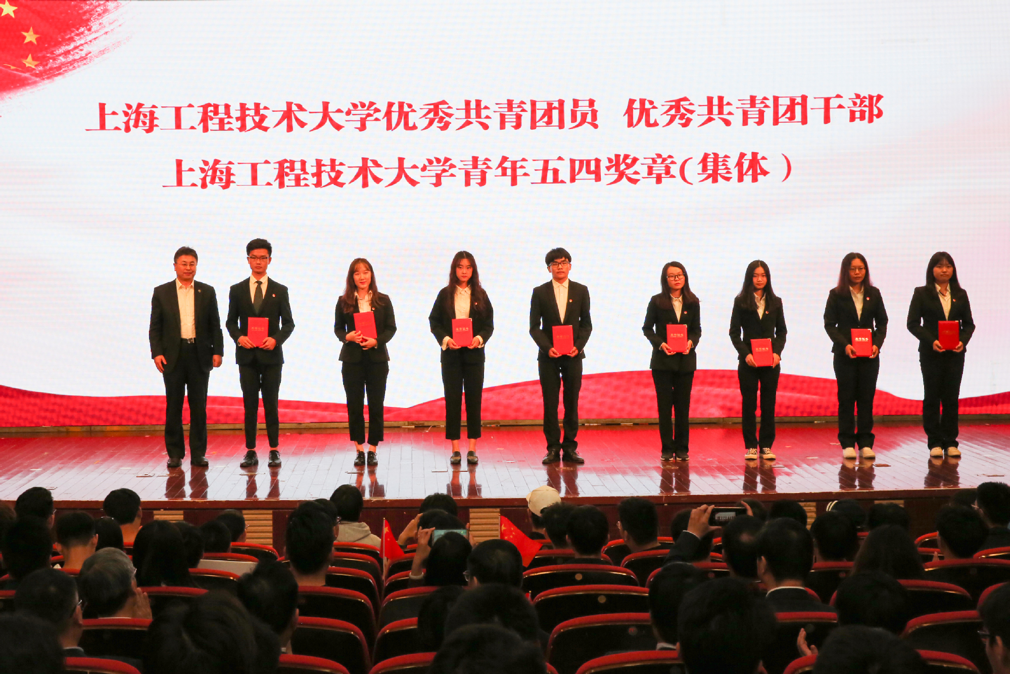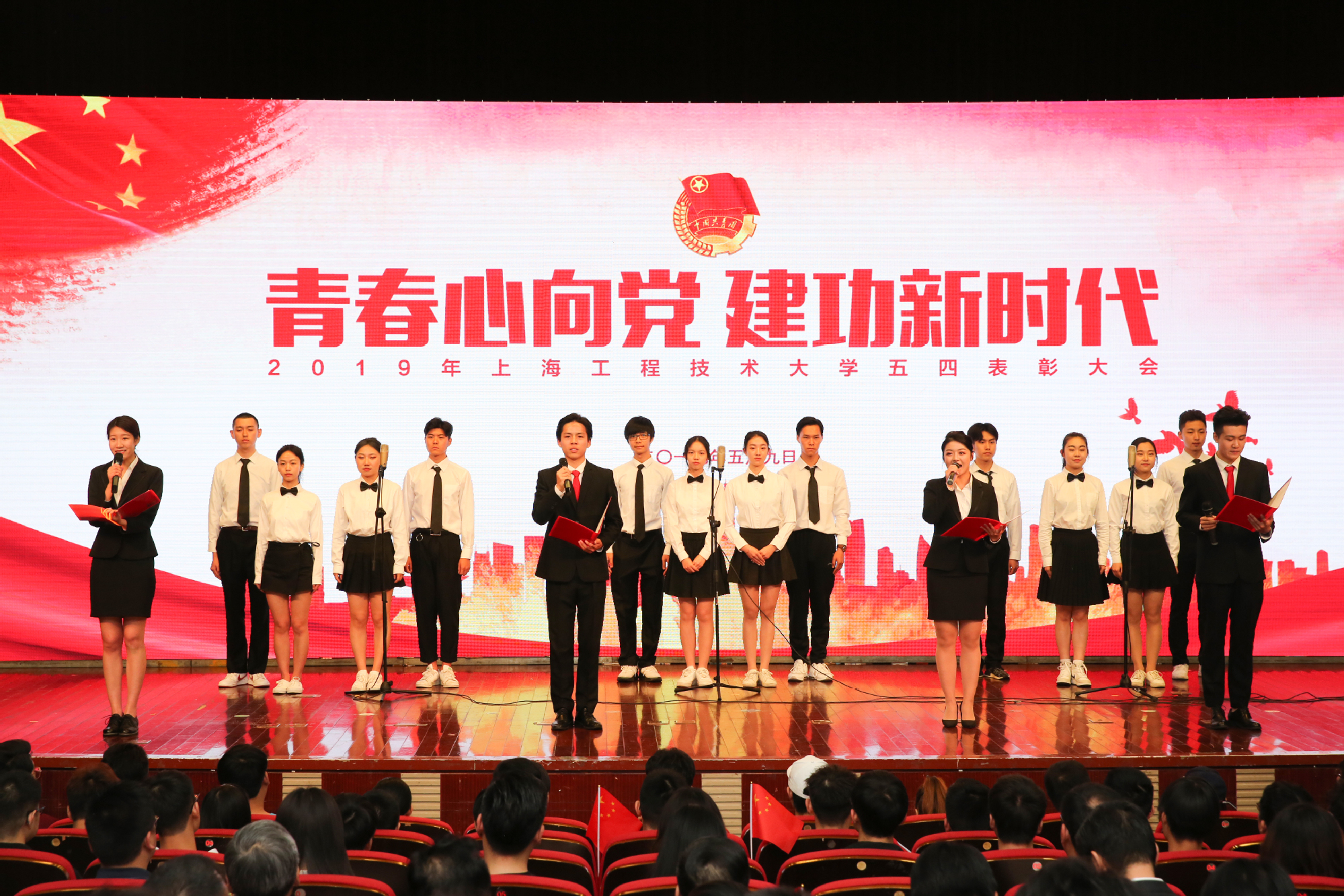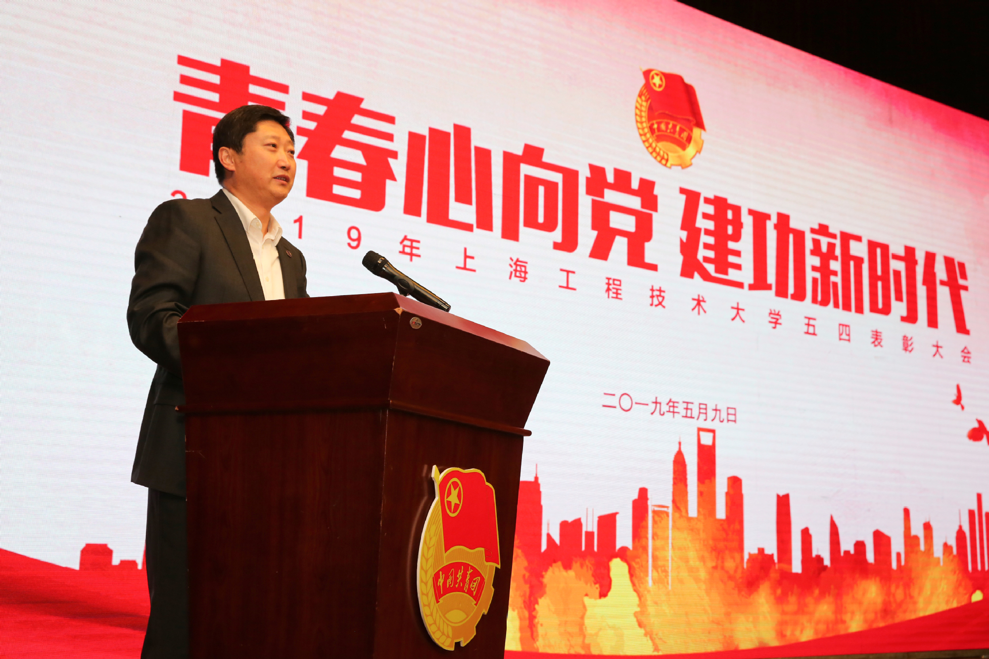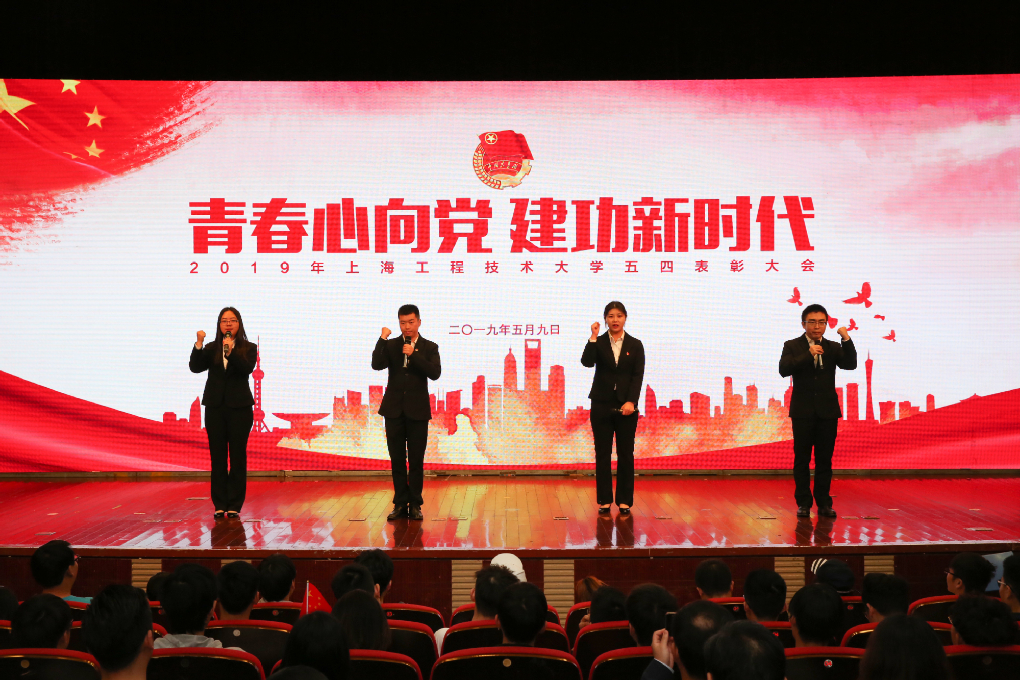在五四运动100周年之际,5月9日下午,学校在图文信息中心志宏堂举行了“青春心向党建功新时代”2019年五四表彰大会。党委书记李江,党委副书记史健勇、鲁嘉华,党委副书记、副校长朱晓青,副校长王岩松出席会议。松江团区委、相关街道团工委,建设银行上海市分行团委负责人,以及即将开展密切工作的江苏宜兴、江苏常熟、浙江海宁等长三角地区的相关负责人,各相关职能处室负责人,各学院党委(党总支)副书记、团委书记以及500余名学生团员代表参加了此次会议。