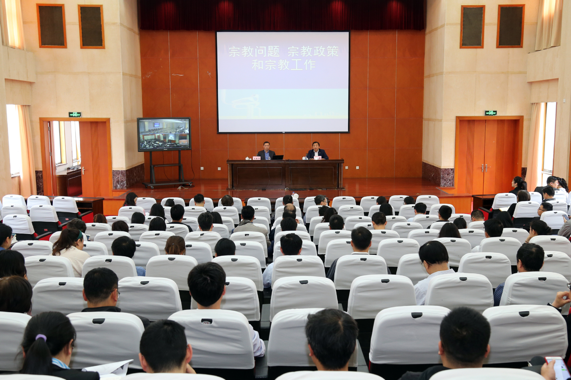 王新华副局长从“什么是宗教问题”展开,系统地分析了宗教问题的产生、当今世界宗教特点和发展趋势,从正确认识宗教问题、正确认识世界宗教发展的特点和趋势、正确处理我国的宗教关系三大方面进行了全面的阐释。在正确认识和处理我国的宗教关系方面,提出要正确认识我国多宗教的国情、正确理解我国的宗教政策、正确处理宗教与社会(国法与教规)的关系、正确处理公民与宗教身份之间的关系。从政治认同、社会适应、文化融入三方面坚持我国宗教中国化方向(中国化),用法律调节涉及宗教的各种社会关系,用法律规范政府管理宗教事务的行为,提高宗教工作法治化水平(法治化)。坚持我国宗教的中国化方向,用社会主义核心价值观引领我国宗教,积极引导宗教与社会主义社会相适应。高校师生要认真学习习近平总书记关于宗教工作的重要论述,着力做好抵御利用宗教对高校进行渗透和防范校园传教工作。