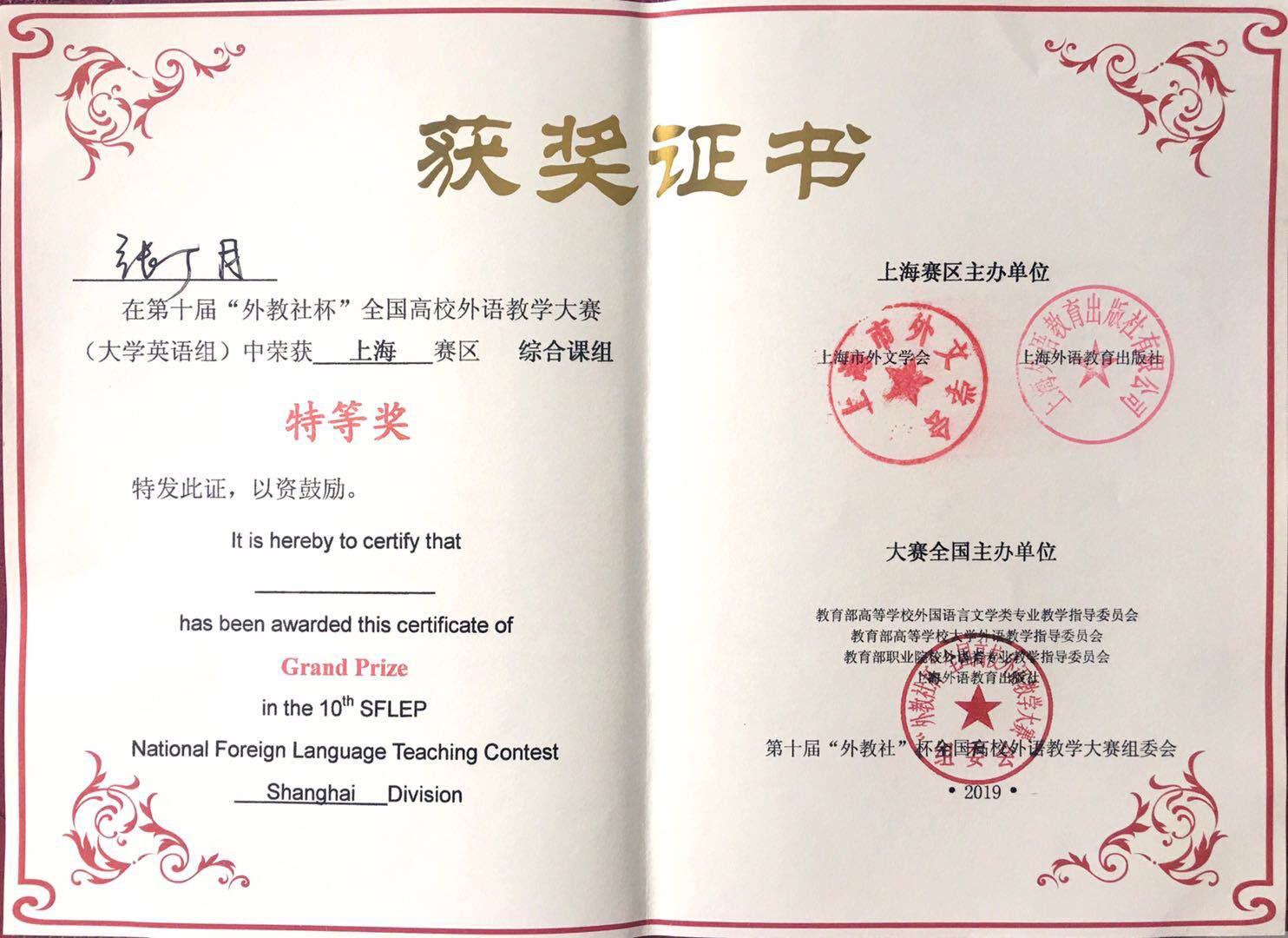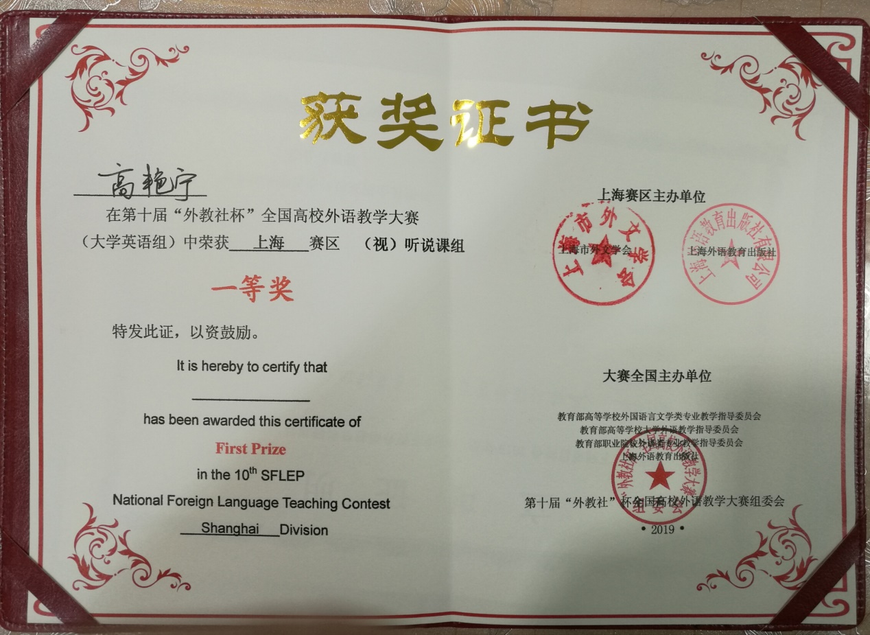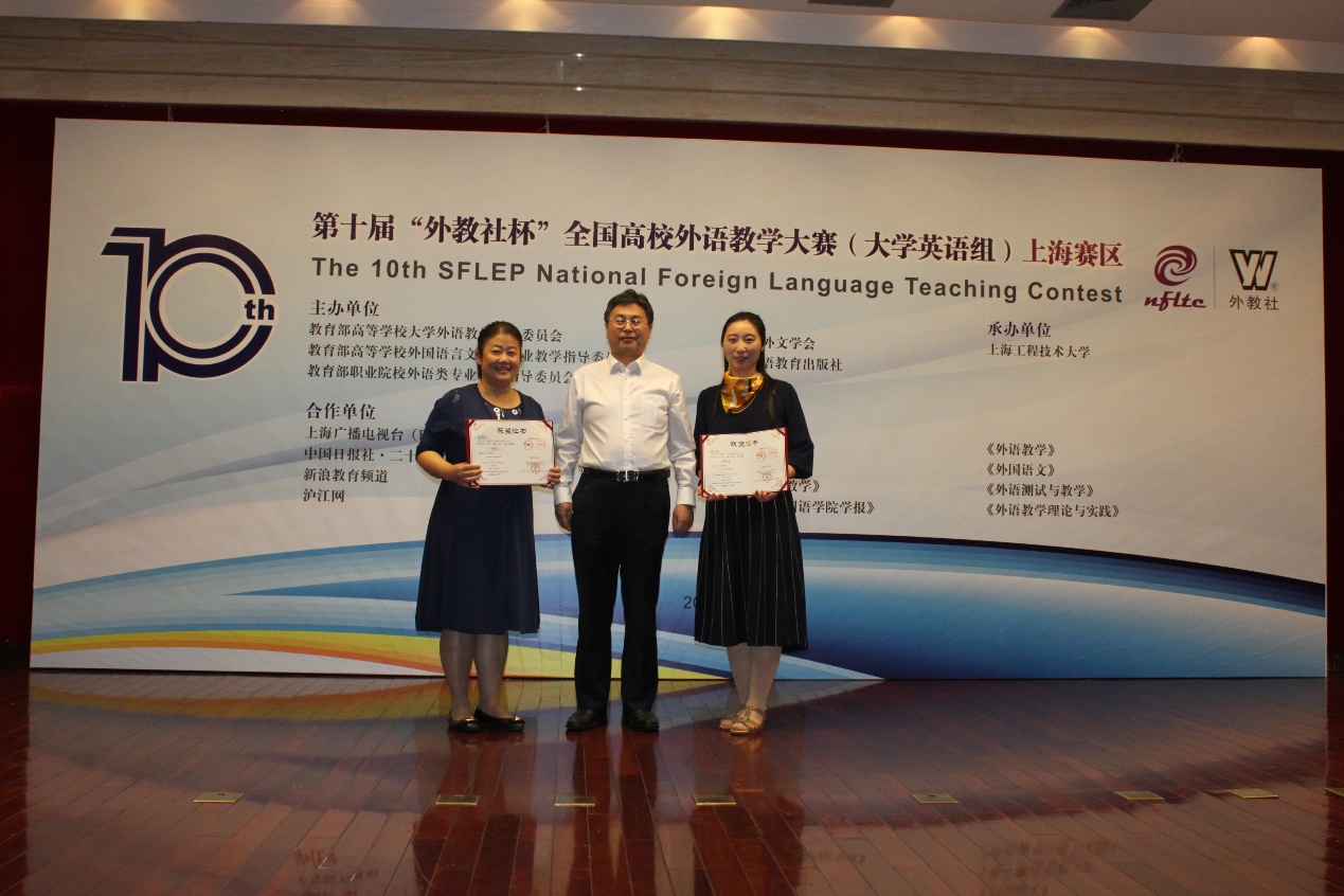 第十届“外教社杯”全国高校外语教学大赛(大学英语组)上海赛区复赛和决赛于5月24——25日在上海工程技术大学松江校区热烈上演并圆满落幕。我校外国语学院的两位选手在大赛中取得骄人成绩,张丁月老师荣获综合课组特等奖,将代表上海赛区参加全国决赛;高艳宁老师荣获(视)听组一等奖。