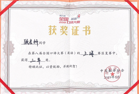 5月25日,在上海理工大学举办的第八届全国口译大赛上海赛区复赛中,经过激烈角逐,我校外国语学院顾君妍同学表现优秀,夺得三等奖。