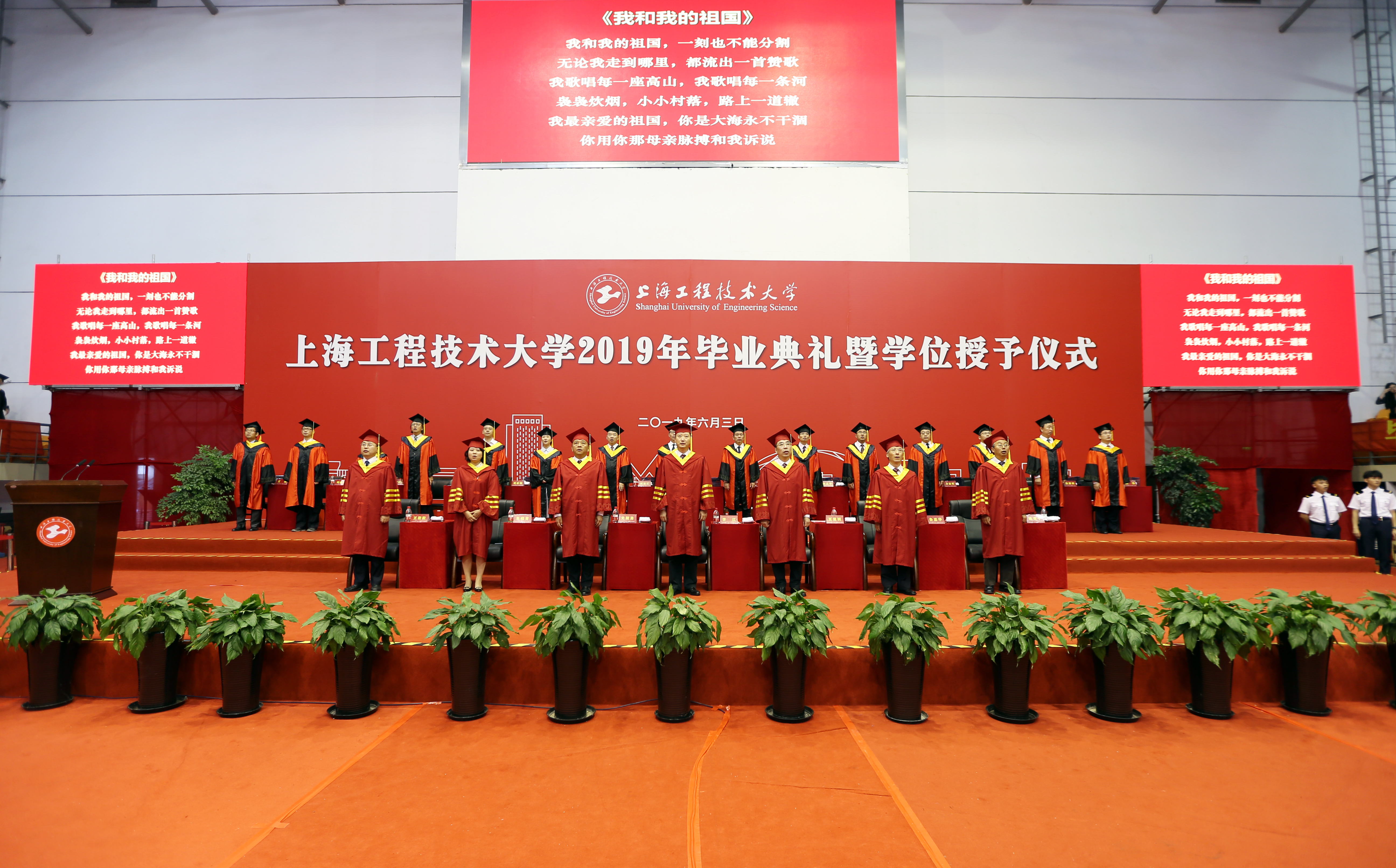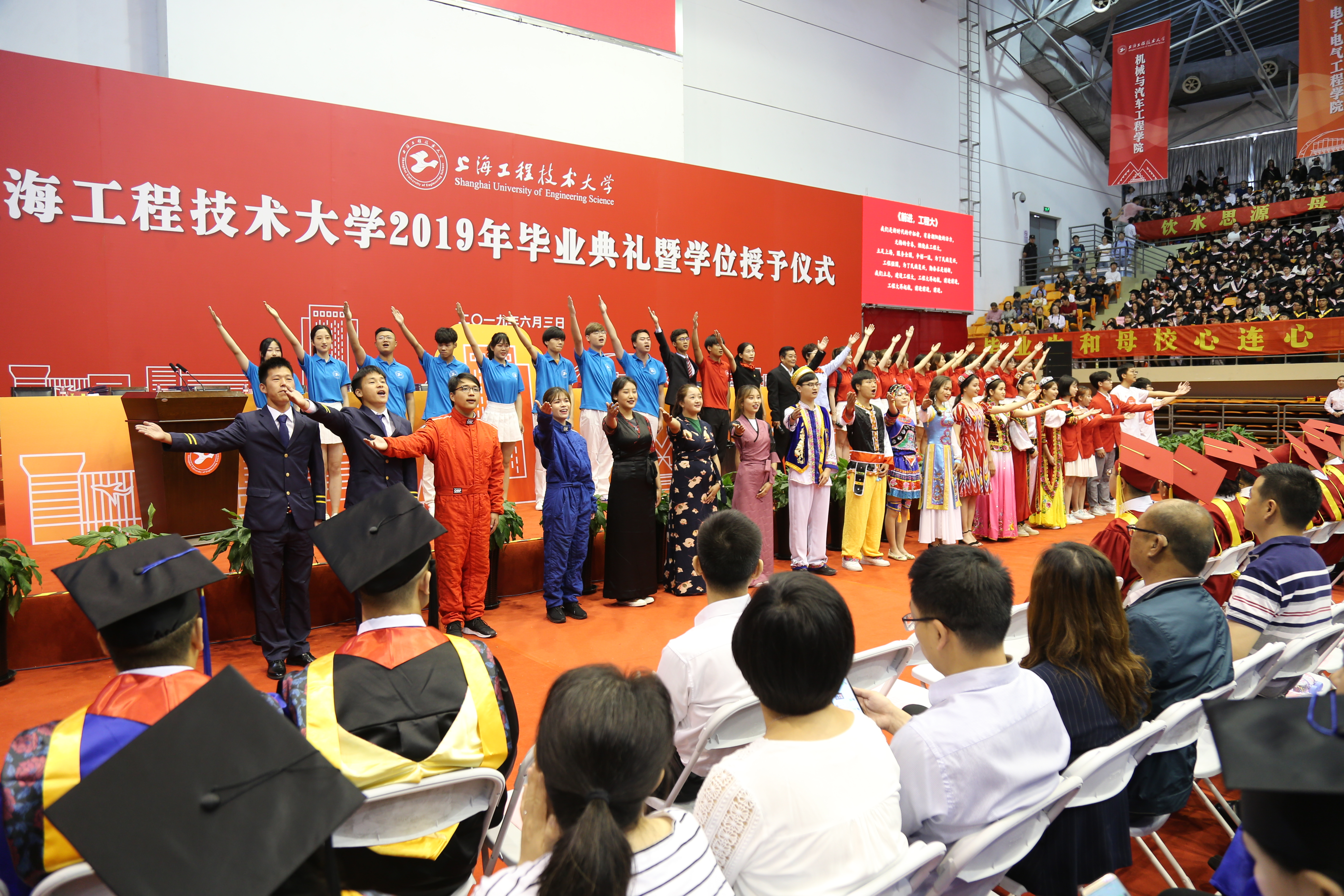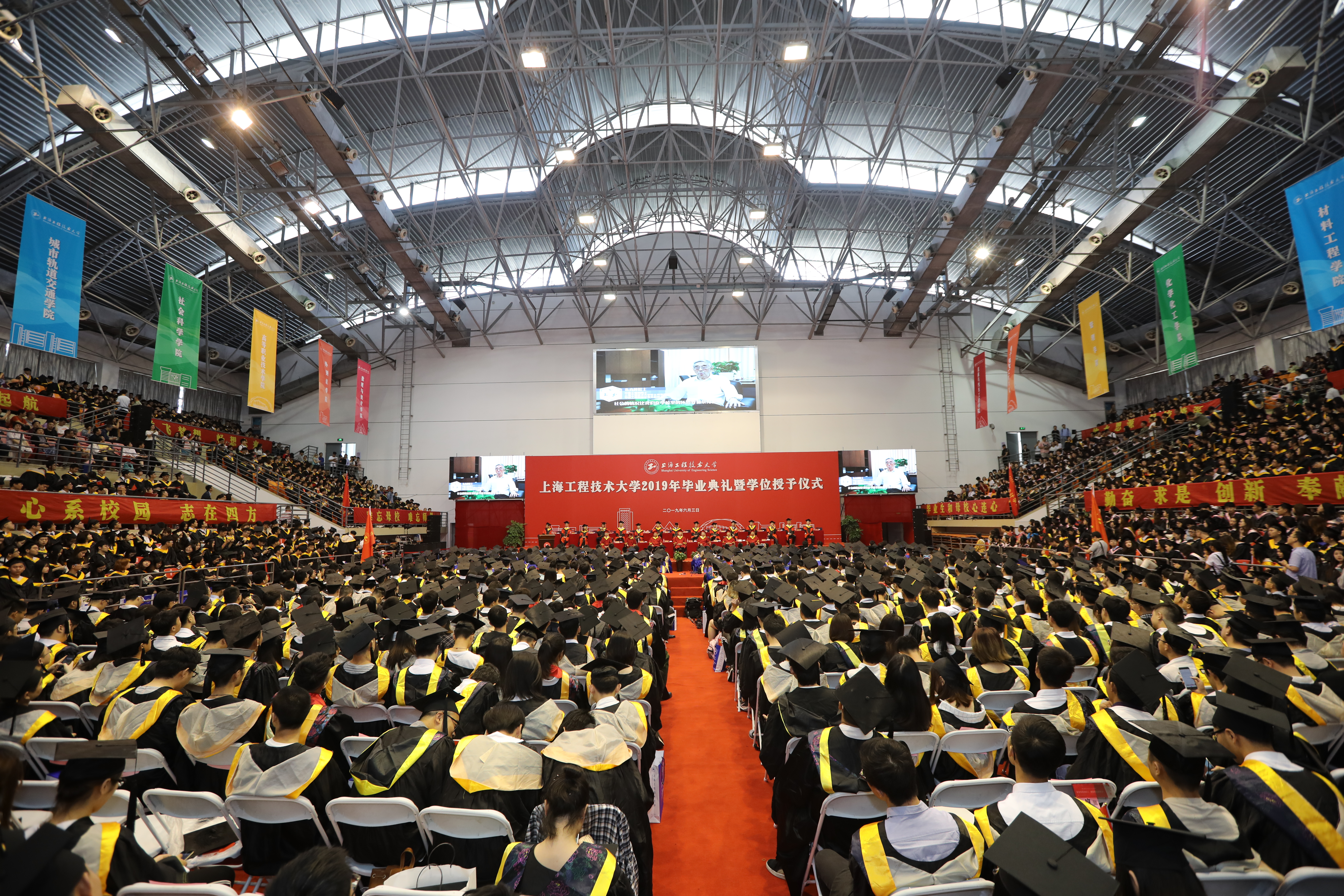6月3日上午,上海工程技术大学2019届毕业典礼在松江校区体育馆内举行。5634名毕业生共聚现场,见证毕业的荣耀时刻,分享开启新征程的喜悦,并祝福全体毕业生开创幸福美好的人生。