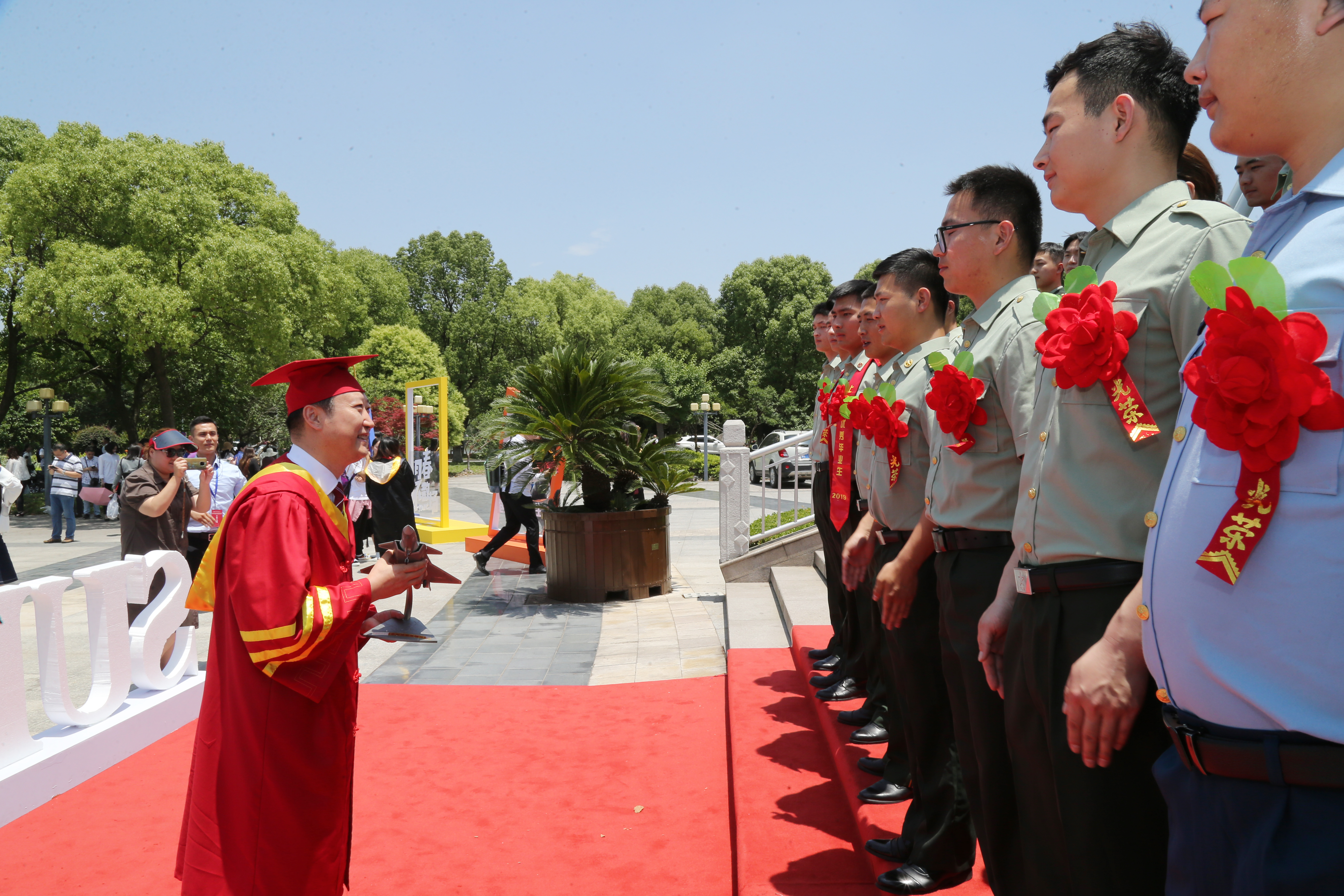 校领导排出档期与毕业生合影是上海工程技术大学的传统,校党委书记李江与全体退伍毕业生合影,并对退伍毕业生表达了慰问与关心。